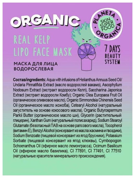 | Состав | Aqua with infusions of Helianthus Annuus Seed Oil/ Undaria Pinnatifida Extract (масло водорослей вакамэ), Ascophyllum Nodosum Extract (экстракт водоросли Келп), Saccharina Japonica Extract (экстракт водоросли Комбу); Organic Olea Europaea Fruit Oil (органическое оливковое масло), Organic Simmondsia Chinensis Seed Oil (органическое масло жожоба), Cetearyl Alcohol (натуральный загуститель на основе кокосового масла), Organic Butyrospermum Parkii Butter (органическое масло ши), Glycerin (растительный глицерин), Xanthan Gum (натуральный полисахарид), Sodium Stearoyl Glutamate (безопасный ПАВ на основе рапсового масла), Tocopherol (витамин Е), Benzyl Alcohol (консервант из масла жасмина и гвоздики), Sodium Benzoate (пищевой консервант из ягод брусники), Potassium Sorbate (пищевой консервант из ягод клюквы), Cymbopogon Schoenanthus Oil (эфирное масло лемонграсса), Ocimum Basilicum Oil (эфирное масло базилика), CI 77891, CI 77491, CI 77510 (натуральные красители минерального происхождения |