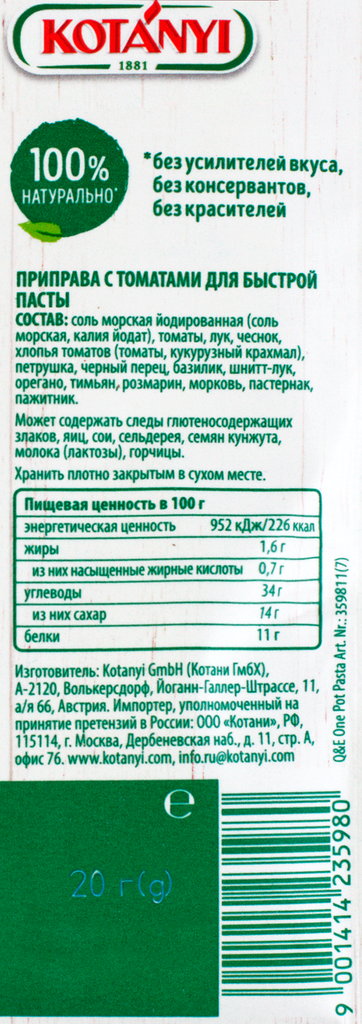 Сервис сравнения цен СкидкаГИД предлагает сравнить цены на товар «Приправа Kotanyi с томатами для пасты 20г»
