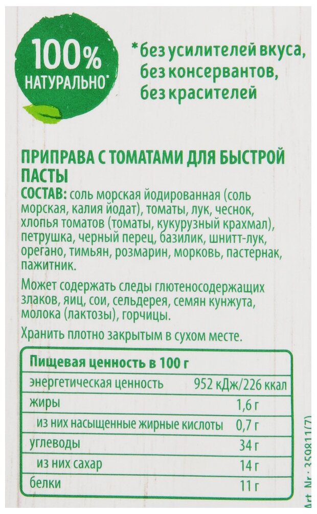 Состав: соль морская йодированная соль морская, калия йодат, томаты, лук, чеснок, хлопья томатов томаты, кукурузный крахмал, петрушка, черный перец, базилик, шнитт-лук, орегано, тимьян, розмарин, морковь, пастернак, пажитник.
