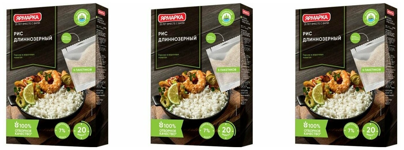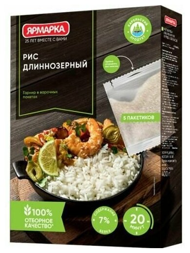 Рис длиннозерный «Ярмарка» - чистый, красивый белый рис высшего качества. Используется для приготовления рассыпчатых гарниров, салатов, вторых блюд с мясом, рыбой, морепродуктами, овощами. Крупы компании «Ярмарка» проходят тщательную доработку на современном высокоточном оборудовании «Sortex». «Sortex» - это оборудование нового поколения, его принцип работы основан на сканировании размера, формы и цвета каждого зернышка, что обеспечивает высокое качество продукции.Способ приготовления: Шаг 1: Пакетик с крупой поместить в кипящую подсоленную воду так, чтобы она полностью покрывала пакетик. Варить на умеренном огне 20-25 мин. Шаг 2: С помощью вилки вынуть пакетик, зацепив его за петлю, и дать воде стечь. Шаг 3: Надорвать пакетик и выложить крупу на блюдо. Способ приготовления в микроволновой печи: Пакетик с крупой поместить в термостойкую посуду и залить кипятком так, чтобы он полностью покрывал пакетик. Посолить и поставить в печь, установив максимальный режим. Готовить 12-15 мин.