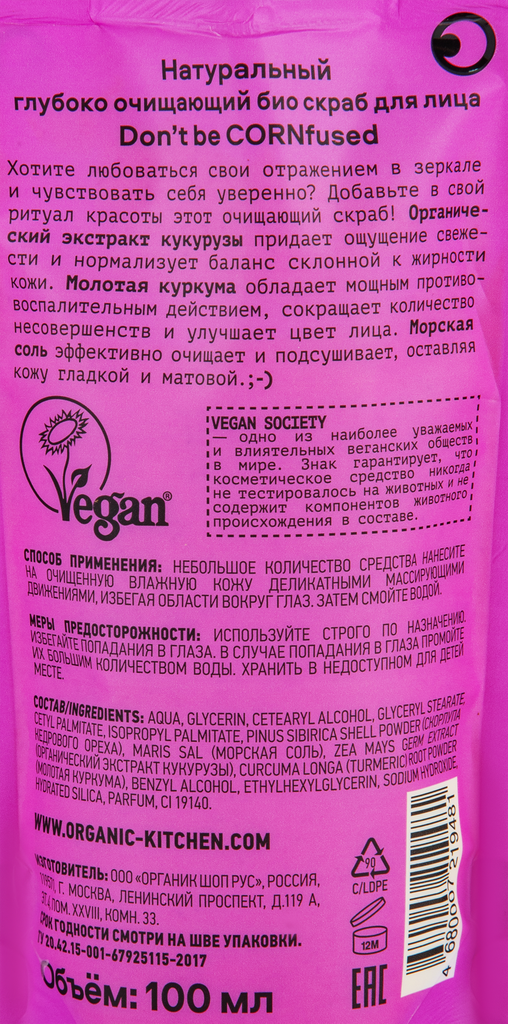 На сегодняшний день товар «Скраб для лица Organic Cornfused Для идеального тона кожи 100мл Organic Kitchen» можно купить с кешбеком в 1 магазине: Vprok (Перекресток)