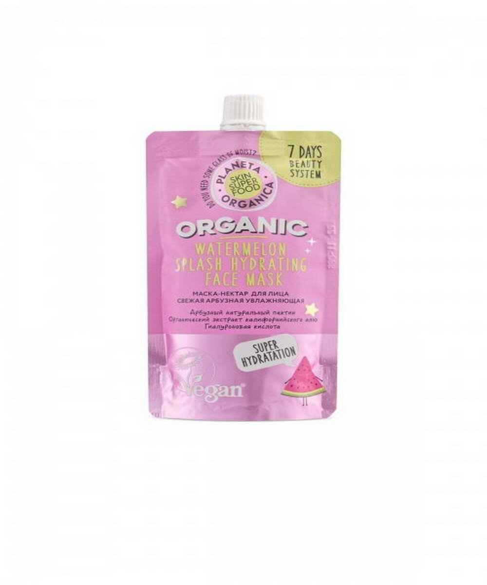 Маска-нектар для лица Planeta Organica Skin Super Food 7 Day Beauty System Арбузная насыщает влагой, придает естественное сияние и гладкость. Содержит натуральные ингредиенты — арбузный пектин, органический экстракт калифорнийского алоэ и высокомолекулярную гиалуроновую кислоту. Активные компоненты повышают упругость и эластичность, стимулируют выработку собственного коллагена и эластина, глубоко увлажняют. Кремовая текстура — легко наносится и равномерно распределяется, не оставляет ощущения стянутости. Отличается нежным ароматом. В мягкой упаковке — не занимает много места, удобно хранить. Подходит для всех типов кожи.Способ применения: небольшое количество маски нанести на чистую сухую кожу лица. Оставить на 10–15 минут. Смыть теплой водой.