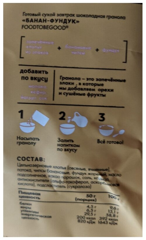 | Состав | Хлопья цельнозерновые (овсяные, ячменные), патока, чипсы банановые, лепестки арахисовые, рис воздушный, отруби овсяные, масло подсолнечное, фундук жареный, какао порошок, соль, корица, антиокислители (альфа-токоферол, аскорбиновая кислота), подсластитель (сукралоза), ароматизатор натуральный |