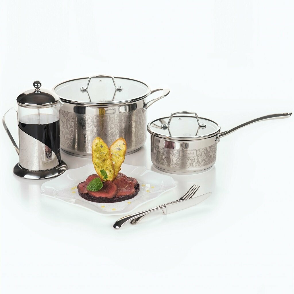 | Прочие особенности и свойства | Уникальный дизайн, выполненный по технологии глубокого травления Внутренние отметки литража Ободок крышки из нержавеющей стали против сколов и трещин Отверстие в крышке для выпуска пара Возможно использование в духовом шкафу (без крышки) Не подходит для посудомоечной машины Подходит для всех видов плит |