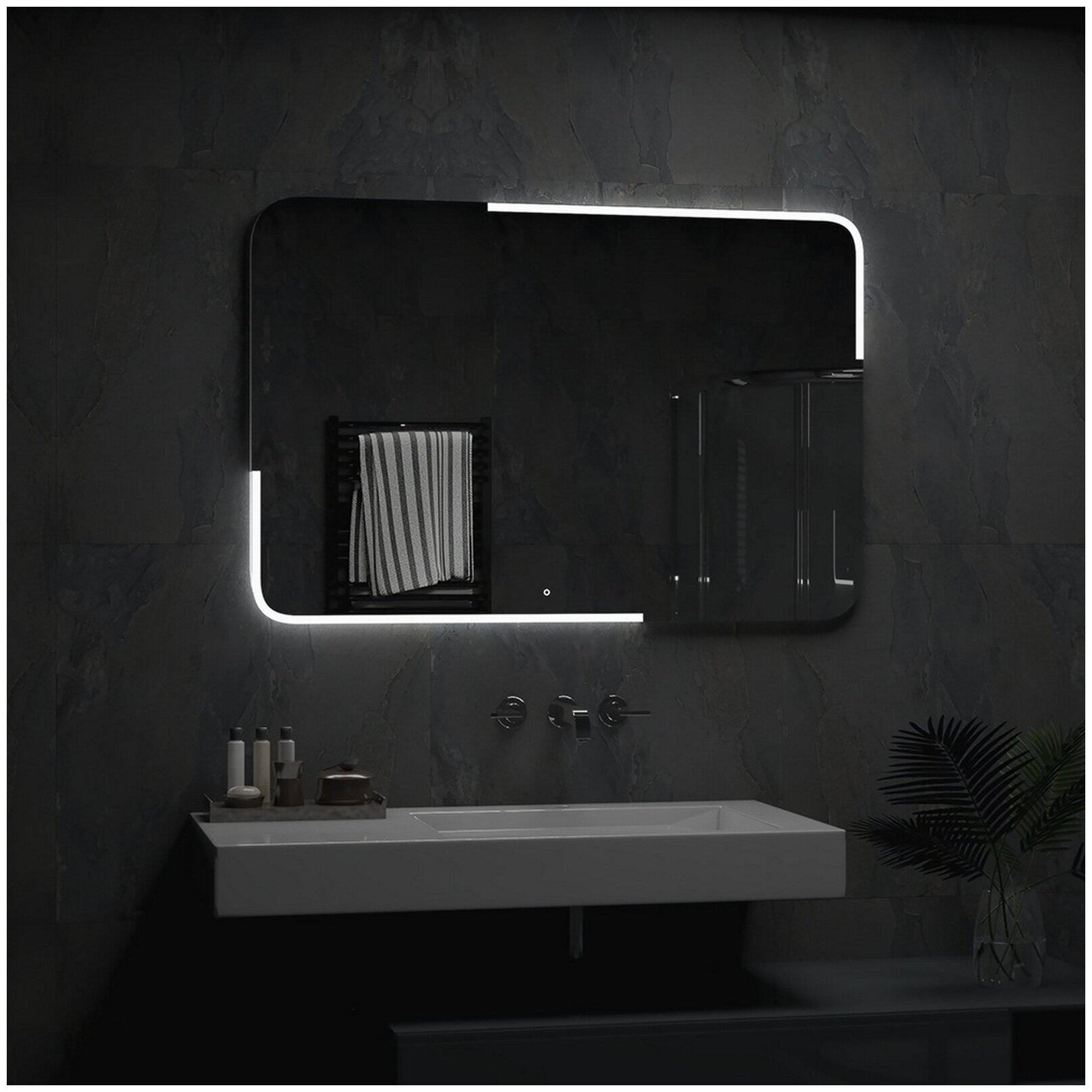 Зеркало изготовлено из зеркального полотна толщиной 4 мм производства ведущего европейского производителя зеркал AGC. Модель отличается стильным минималистическим дизайном.В качестве элемента LED-подсветки используется светодиодная лента с плотностью диодов 120 шт./м мощностью 9,6Вт/м.Это создает мягкое и равномерное свечение по периметру всего зеркала.Электрические компоненты размещены внутри корпуса, край полотна обработан еврокромкой, что обеспечивает надежную защиту от случайных порезов при контакте с изделием.Управление подсветкой осуществляется при помощи сенсорной кнопки, вынесенной на лицевую панель для удобства настройки необходимой яркости.Зеркало поставляется в комплекте с настенным крепежом.Изделие прошло обязательную сертификацию и может использоваться в помещениях с повышенной влажностью воздуха.Срок гарантии - 2 года.