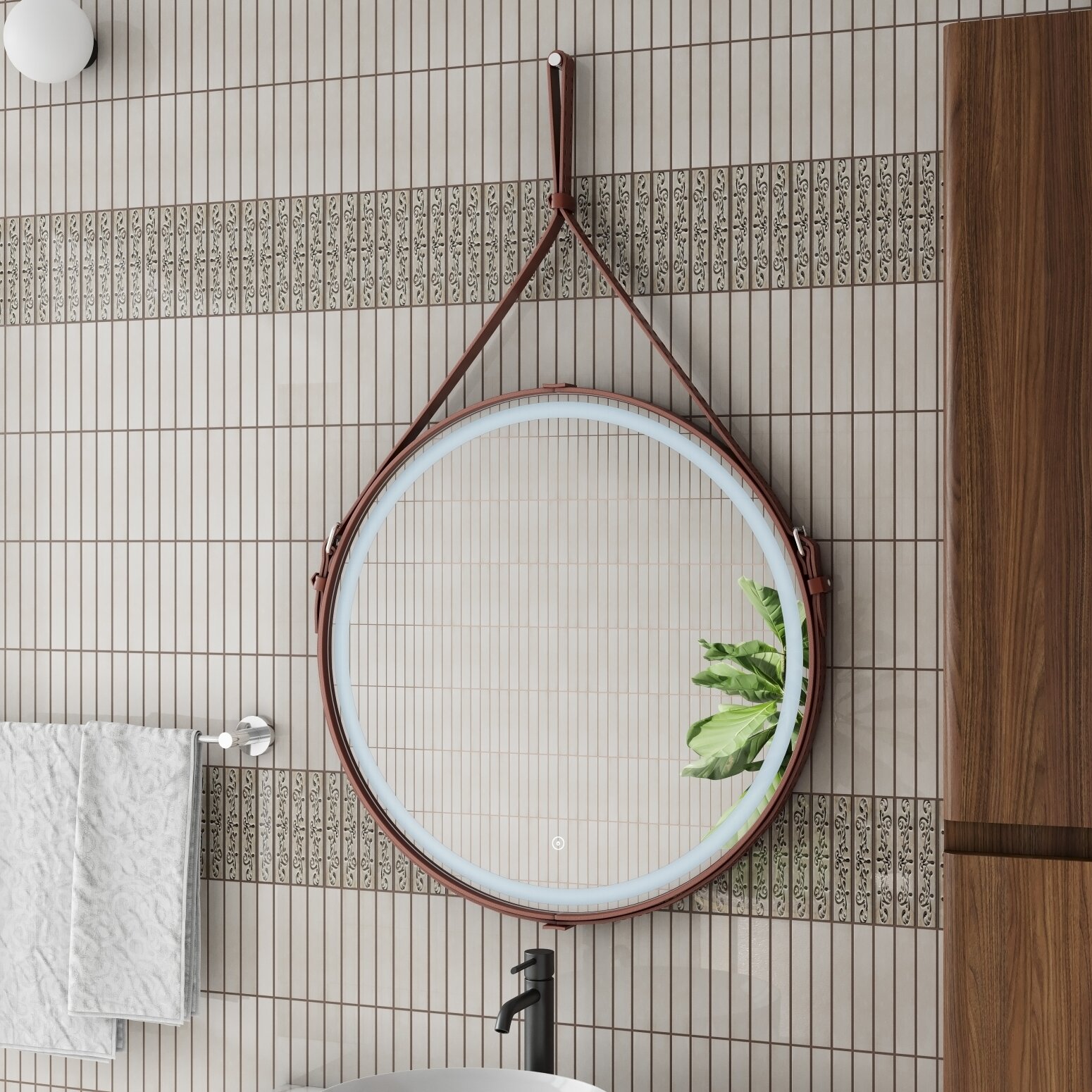 Серия "Millenium" - это уникальные стильные зеркала на кожаных ремнях. В изготовлении используется только натуральная кожа в 3-х цветах: белый, черный, коричневый. Зеркальное полотно толщиной 4 мм от ведущего европейского производителя зеркал AGC обработано еврокромкой по краю, что обеспечивает безопасный контакт с изделием. Кнопка сенсорного управления яркостью подсветки удобно расположена в нижней части зеркала. При изготовлении используется светодиодная лента с плотностью диодов 120 шт./м и мощностью 9,6Вт/м, создающая мягкое и равномерное свечение по периметру зеркала. Подсветка рассчитана на 50 000 часов работы в непрерывном режиме. Все электрические компоненты размещены внутри корпуса из влагостойкого МДФ. В комплекте предусмотрен настенный крепеж. Изделие прошло обязательную сертификацию и может использоваться в помещениях с повышенной влажностью воздуха. Гарантия - 2 года.