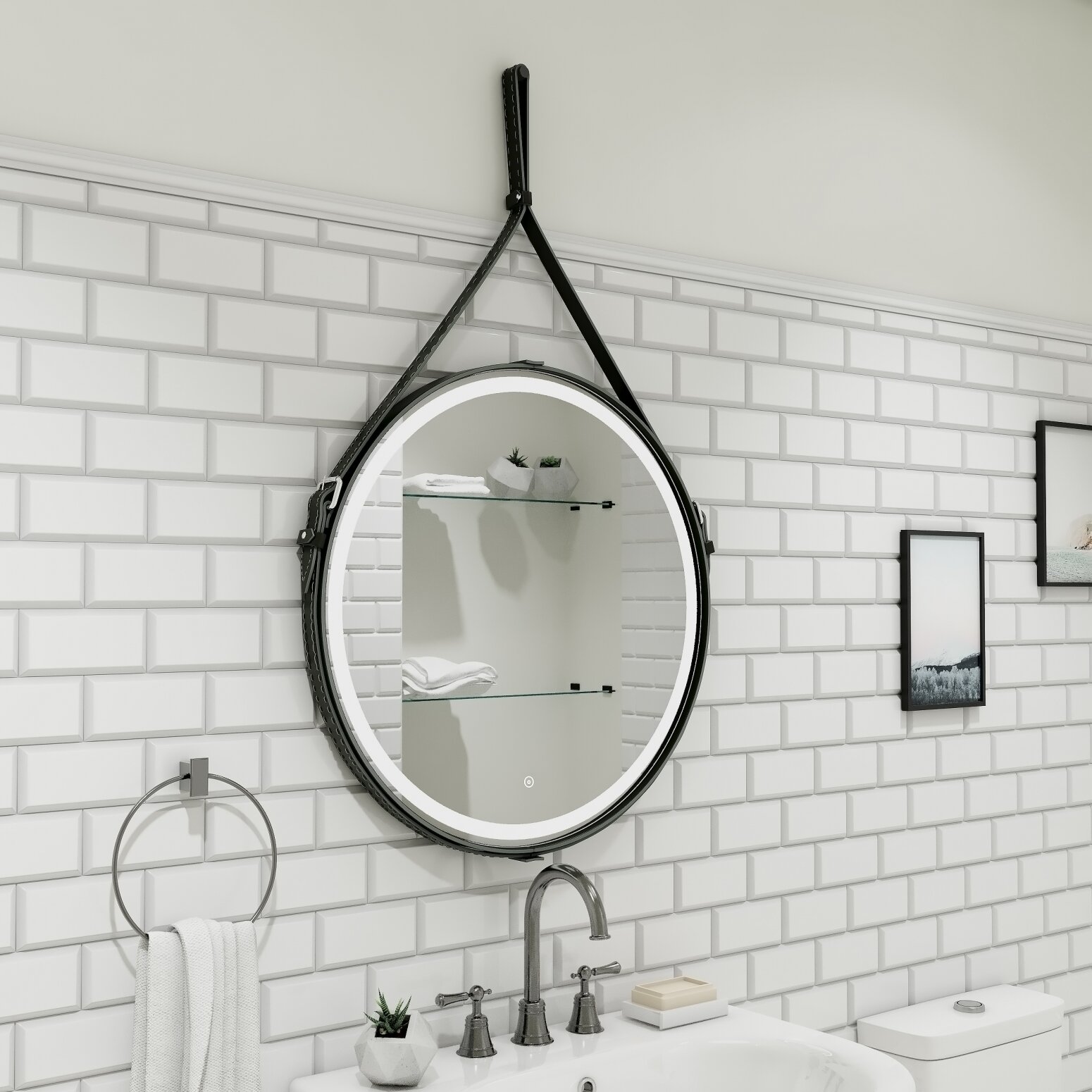 Серия "Millenium" D650 - это уникальные стильные зеркала на кожаных ремнях. В изготовлении используется только натуральная кожа в 3-х цветах: белый, черный, коричневый.Зеркальное полотно толщиной 4 мм от ведущего европейского производителя зеркал AGC обработано еврокромкой по краю, что обеспечивает безопасный контакт с изделием.Кнопка сенсорного управления яркостью подсветки удобно расположена в нижней части зеркала.При изготовлении используется светодиодная лента с плотностью диодов 120 шт./м и мощностью 9,6Вт/м,создающая мягкое и равномерное свечение по периметру зеркала. Подсветка рассчитана на 50 000 часов работы в непрерывном режиме.Все электрические компоненты размещены внутри корпуса из влагостойкого МДФ. В комплекте предусмотрен настенный крепеж.Изделие прошло обязательную сертификацию и может использоваться в помещениях с повышенной влажностью воздуха.