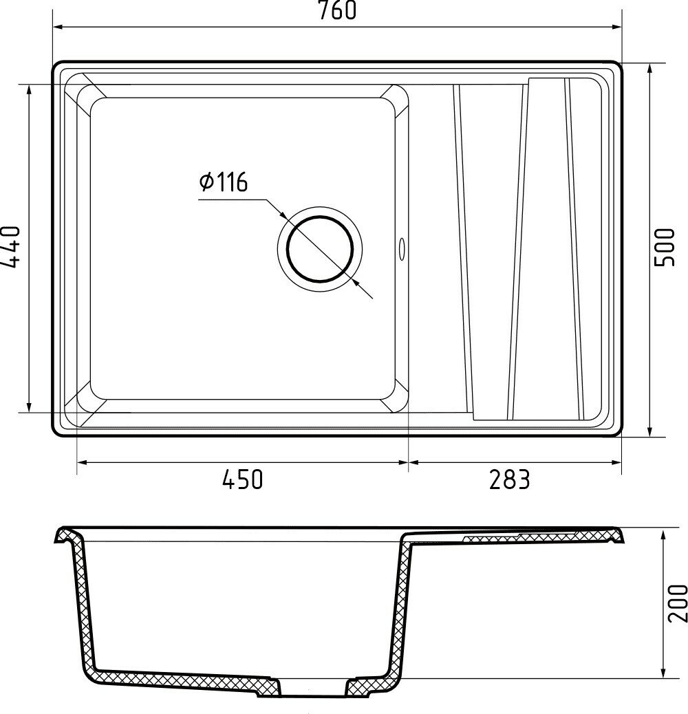 Функциональное крыло подойдет для использования в качестве дополнительной рабочей поверхности, а глубокая и просторная чаша удобна для мытья крупной посуды.