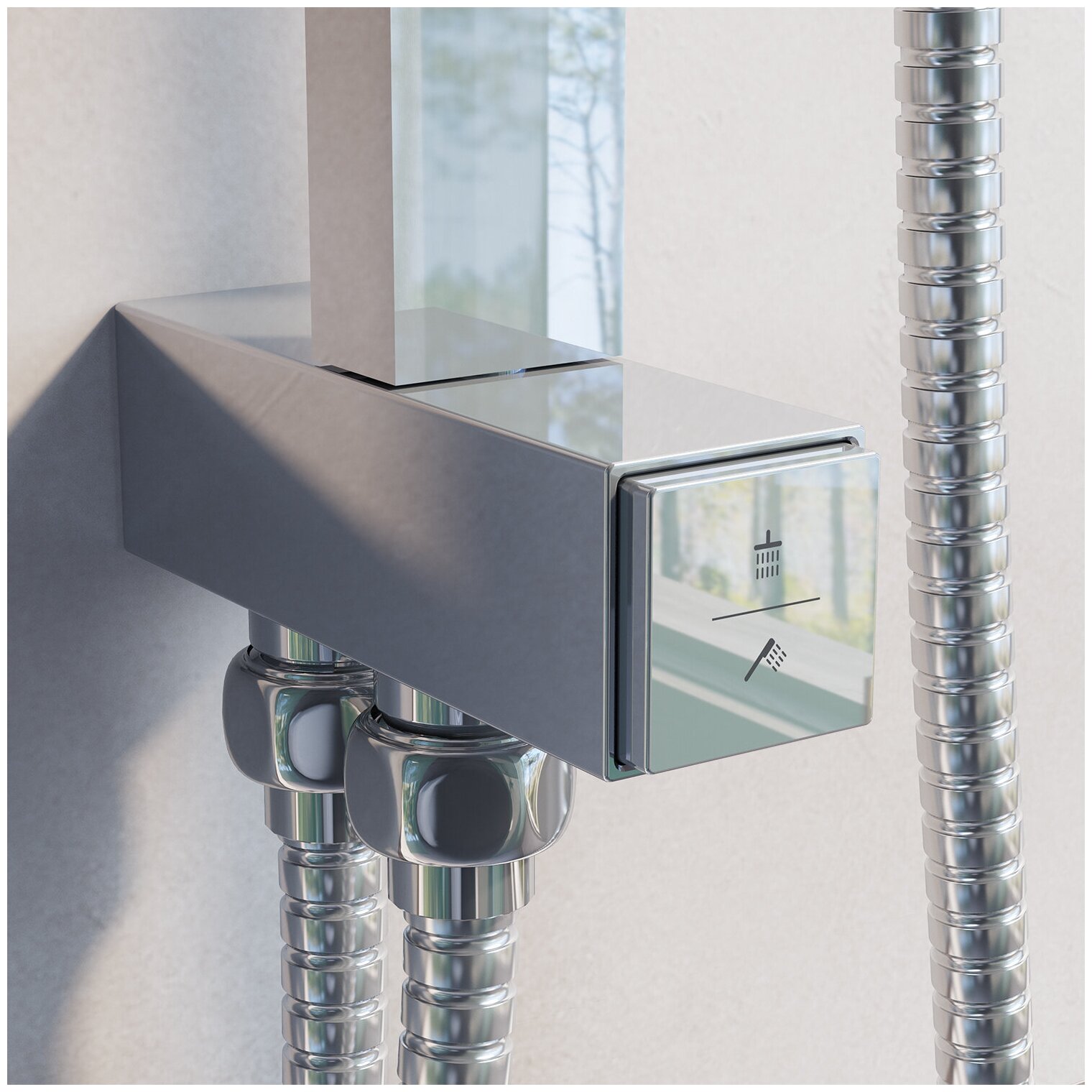 Душевой гарнитур Bild с верхним душем прямоугольной формы отличают выраженные геометрические формы и стильная хромированная лицевая поверхность лейки. Регулируемая высота стойки (от 900 до 1300 мм) позволяет принимать душ с комфортом даже самым высоким.