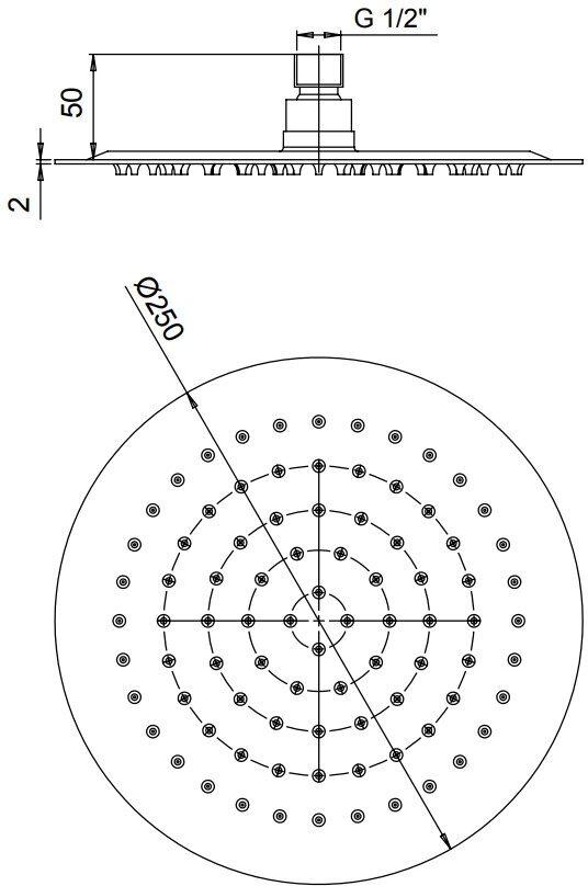 Верхний душ Paini , 250 мм, круглый, ультратонкий. Лекгоочищаемый (резиновые форсунки). 1-функциональный. Для комбинации с настенным или потолочным кронштейном. В комплекте поставки: верхний душ.
