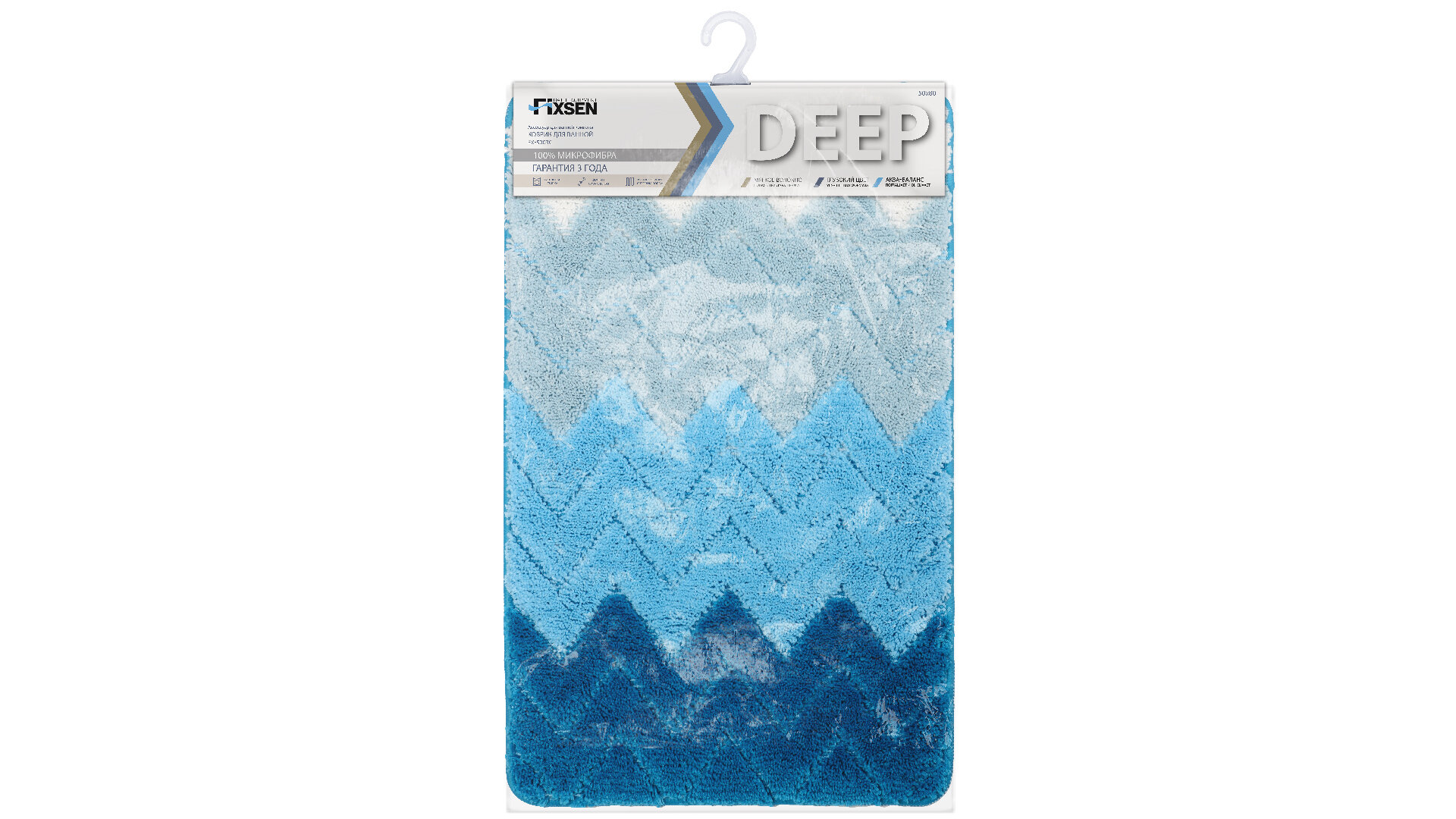 Коврик для ванной комнаты Deep FX-5003C дополнит дизайн интерьера и обеспечит комфортное завершение водных процедур. Размер модели средний — 80 × 50 см, толщина составляет 2,2 см. Коврик с рисунком-зигзагом, расцветка — голубая. Изготовлен аксессуар из микрофибры. Материал приятный на ощупь, хорошо переносит высокую влажность и быстро высыхает. Противоскользящее покрытие основания повышает безопасность использования коврика.