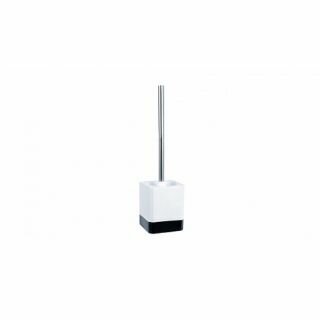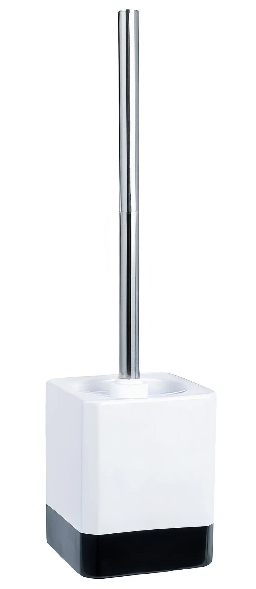 Ручка ёршика прямая, средней длины. Жесткая щетина хорошо очищает поверхность сантехники. Форма подставки прямоугольная. Поверхность изделия глянцевая, цвета — белый и чёрный. Материал — керамика.