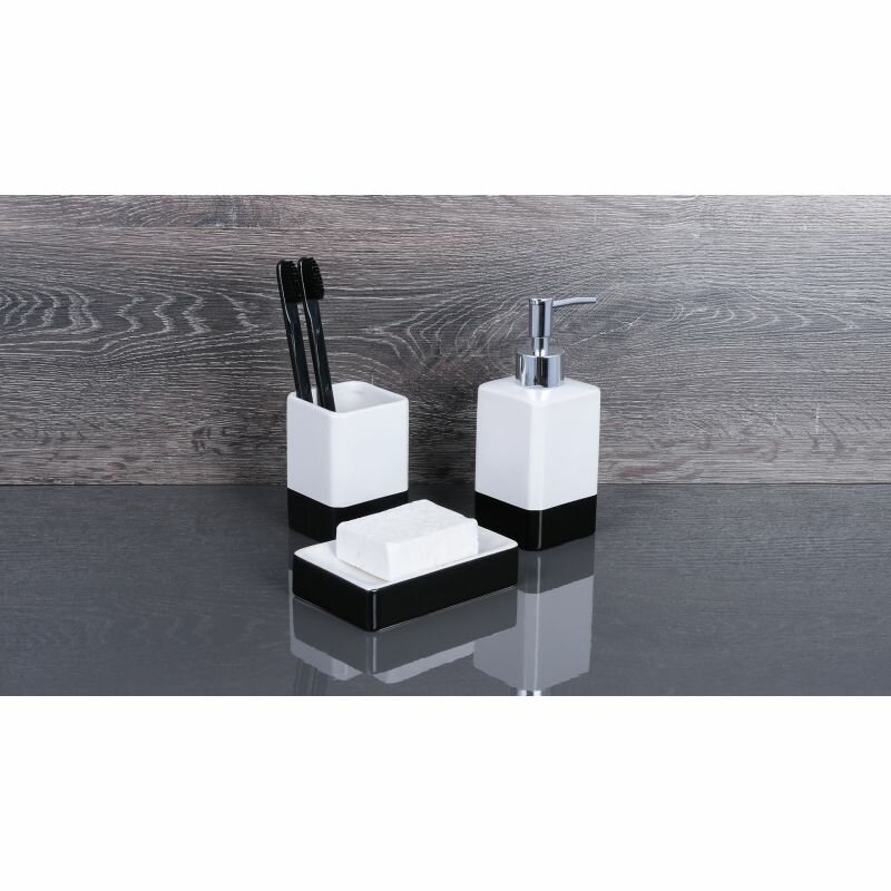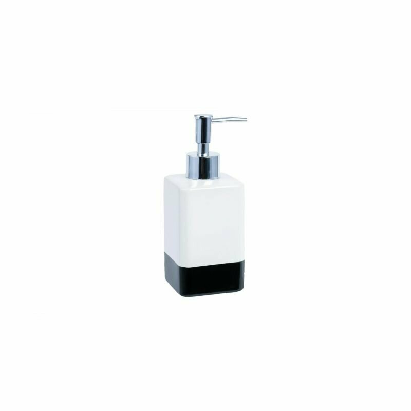 Флакон прямоугольной формы изготовлен из керамики с гладкой глянцевой поверхностью. Материал насоса — пластик. Модель настольная (без крепления) — можно ставить в любом удобном месте столешницы или раковины.