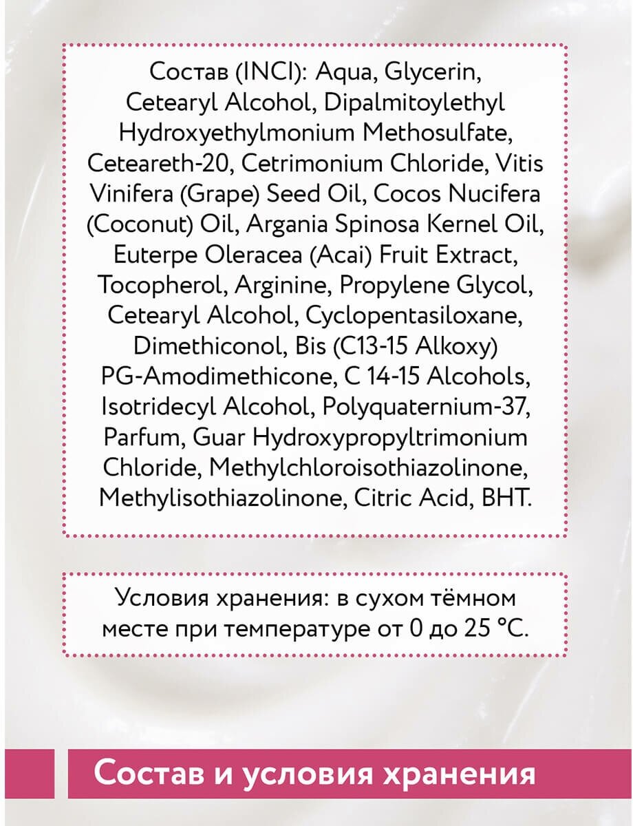 | Состав | Aqua, Glycerin, Cetearyl Alcohol, Dipalmitoylethyl, Hydroxyethylmonium Methosulfate, Ceteareth-20, Cetrimonium Chloride, Vitis Vinifera (Grape) Seed Oil, Cocos Nucifera (coconut) Oil, Argania Spinosa Kernel Oil, Euterpe Oleracea (Acai) Fruit Extract, Tocopherol, Arginine, Propylene Glycol, Cetearyl Alcohol, Cyclopentasiloxane, Dimethiconol, Bis (C13-15 Alkoxy) Pg-amodimethicone, C14-15 Alcohols, Isotridecyl Alcohol, Methyl Alcohol, Polyquaternium-37, Parfum, Guar Hydroxypropyltrimonium Chloride, Methylchloroisothiazolinone, Methylisothiazolinone, Citric Acid, BHT |