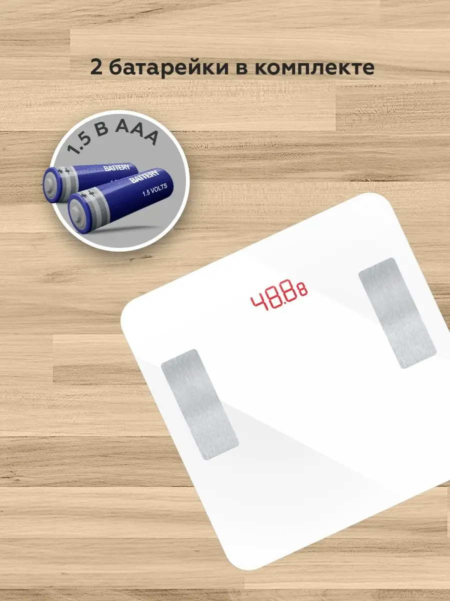 | Дополнительная информация | приложение для смартфона "SmartLife", автоматическое обнуление результата, силиконовые ножки, измерение веса по 4 датчикам, минимальный вес 8 кг, LED-дисплей |