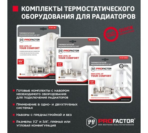 головка термостатическая PF RVT 384.Преимущества термостатических комплектов PROFACTOR®Высокое качество товаров PROFACTOR®, входящих в комплект термостатического оборудования для радиатора, гарантирует их максимальную надёжность и длительный срок эксплуатации;