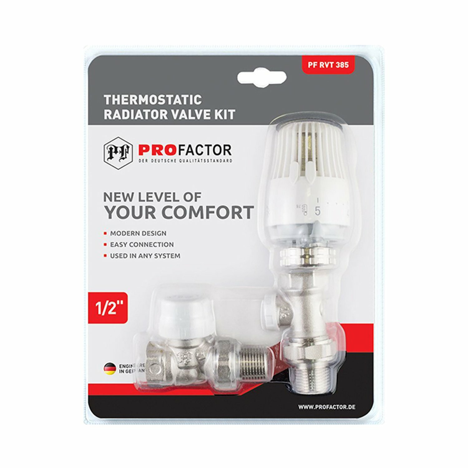 ОписаниеКомплект радиатора термостатический PROFACTOR предназначен для подключения отопительных приборов и плавного регулирования теплового режима в помещении за счет изменения расхода теплоносителя в отопительных системах, может использоваться в однотрубных и двухтрубных системах отопления. Применение термостатический комплекта позволяет уменьшить потребление тепловой энергииСостав термостатического комплекта PF RVT 385: клапан термостатический прямой PF RVT 380;