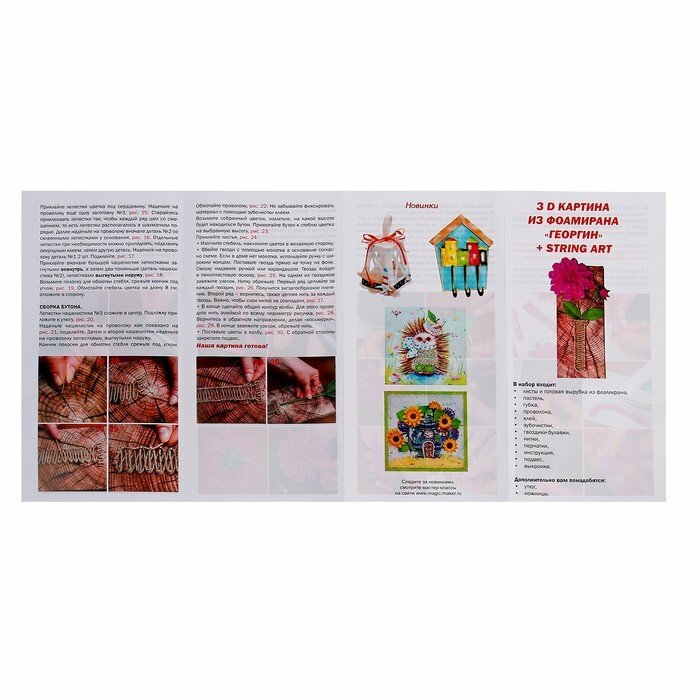 Эта удивительная серия картин — возможность открыть для себя две техники рукоделия в одном наборе. Вы ответите на вопрос, подходит для вас данные виды творчества или нет. Фоамиран — исключительный материал, легко поддающийся тепловой обработке, за счет которой, плоские детали приобретают объем и превращают картину в настоящую арт-композицию. Нити гармонично обрамляют картину и позволяют сделать первые шаги в освоении техники SТRING ART.
