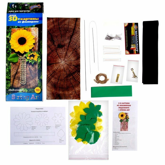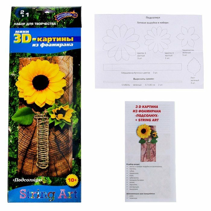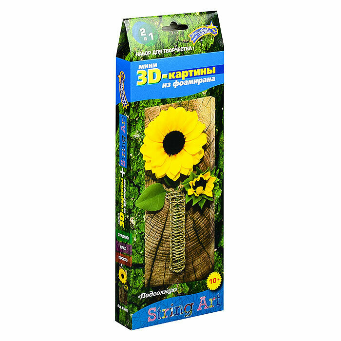Эта удивительная серия картин — возможность открыть для себя две техники рукоделия в одном наборе. Вы ответите на вопрос, подходит для вас данные виды творчества или нет. Фоамиран — исключительный материал, легко поддающийся тепловой обработке, за счет которой, плоские детали приобретают объем и превращают картину в настоящую арт-композицию. Нити гармонично обрамляют картину и позволяют сделать первые шаги в освоении техники SТRING ART.