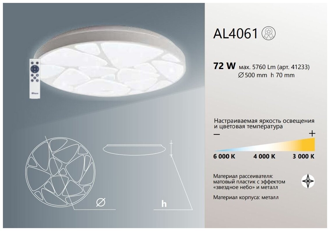 - Режим освещенности можно регулировать при помощи пульта управления (от 10 до 100%)