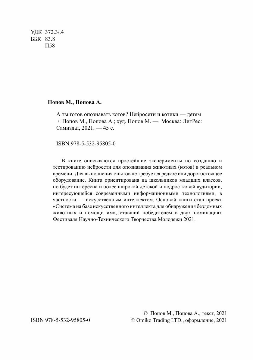 3) и последнее – если Вы внимательно читали аннотацию, то заметили, что изначально проект по опознаванию котов выполнен ребенком (8 лет) для Фестиваля научно-технического творчества, где победил в двух номинациях. После этого в соавторстве именно с ребенком была написана данная книга. Вы продолжаете считать, что «ребенка этим не заинтересовать»? Да, каким-то детям интересны котики и собачки, а не нейросети и компьютеры, и это нормально, но не надо говорить за всех.