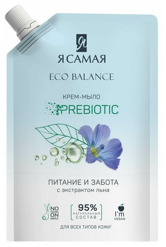 Крем-мыло для рук Я самая ECO BALANCE c экстрактом льна, 500 млЖидкое крем-мыло для рук с экстрактом льна обеспечивает бережное очищение кожи, одновременно ухаживая за ней и сохраняя природную красоту. Натуральный растительный пребиотик Biolin P восстанавливает естественный микробиом кожи и усиливает ее защитные функции, поддерживая максимальную увлажненность и уменьшая риск возникновения несовершенств. Экстракт льна благотворно влияет на чувствительную кожу, успокаивает и питает, препятствуя истощению клеток. Подходит для всех типов кожи.