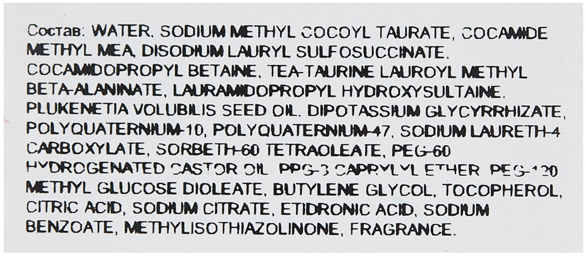 Состав: water, sodium methyl cocoyl taurate, cocamide methyl mea, disodium lauryl sulfosuccinate, cocamidopropyl betaine, tea-taurine lauroyl methyl beta-alaninate, lauramidopropyl hydroxysultaine, plukenetia volubilis seed oil, dipotassium glycyrrhizate, polyquaternium-10, polyquaternium-47, sodium laureth-4 carboxylate, sorbeth-60 tetraoleate, peg-60 hydrogenated castor oil, ppg-3 caprylyl ether, peg-120 methyl glucose dioleate, butylene glycol, tocopherol, citric acid, sodium citrate, etidronic acid, sodium benzoate, methylisothiazolinone, fragrance.