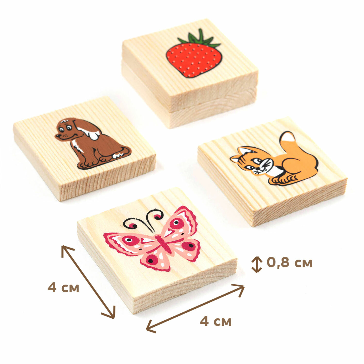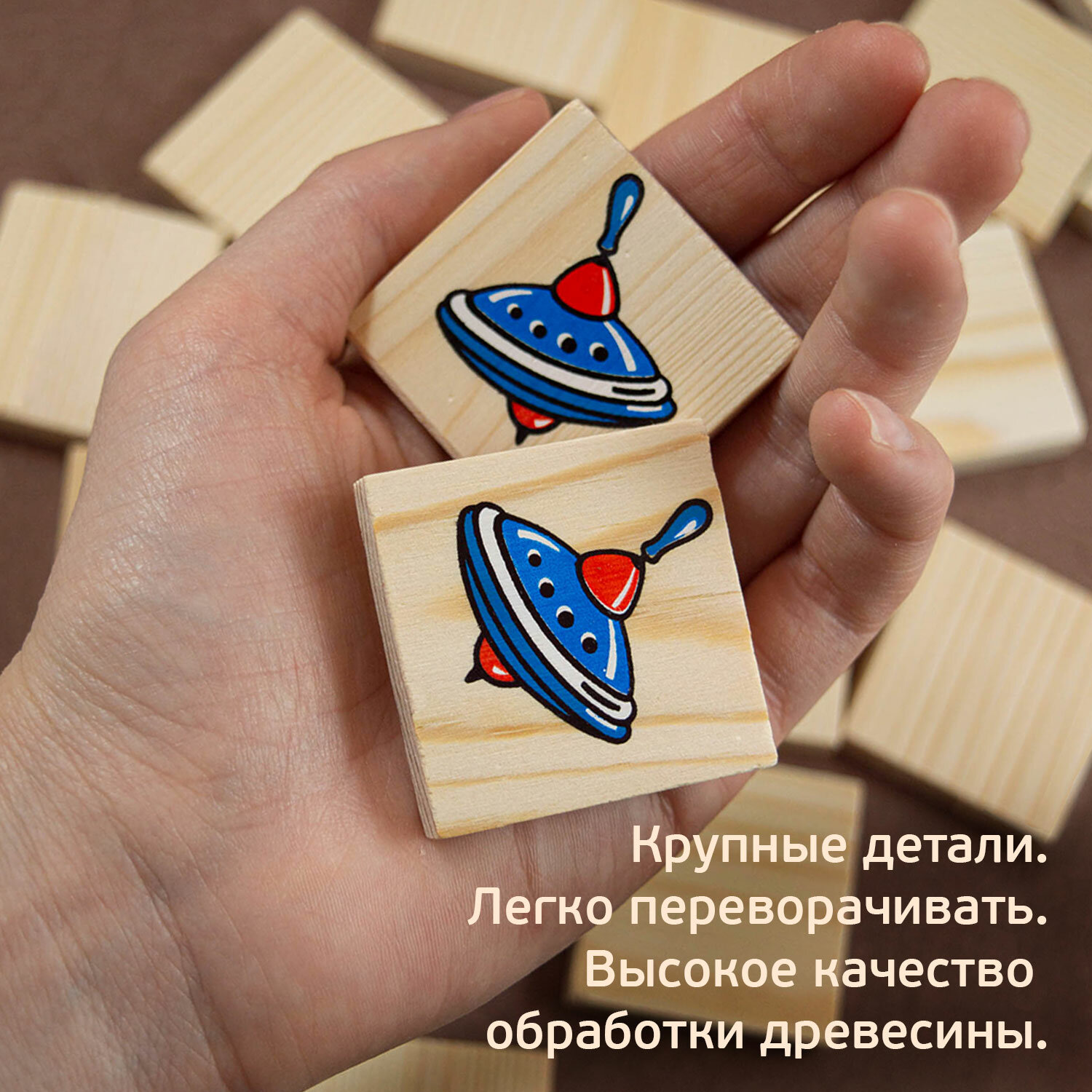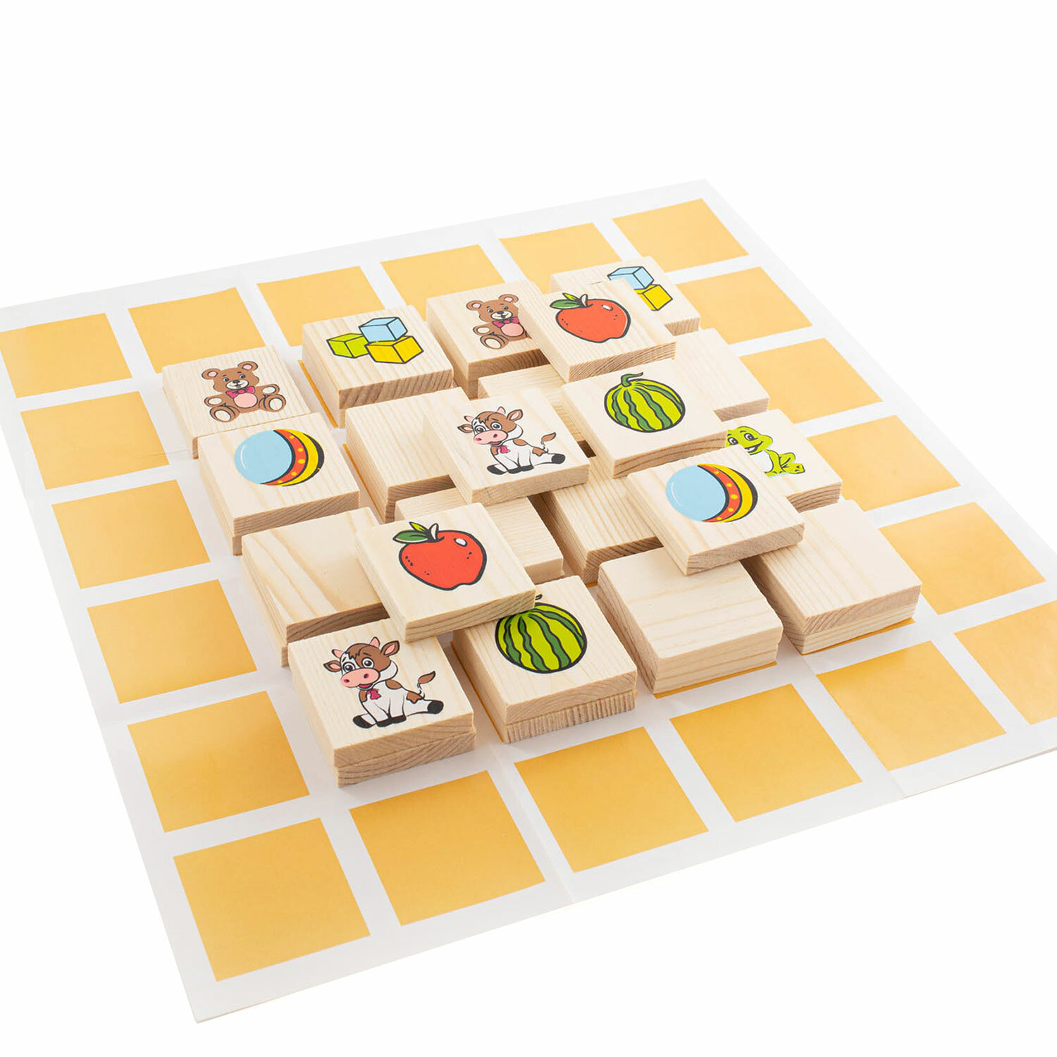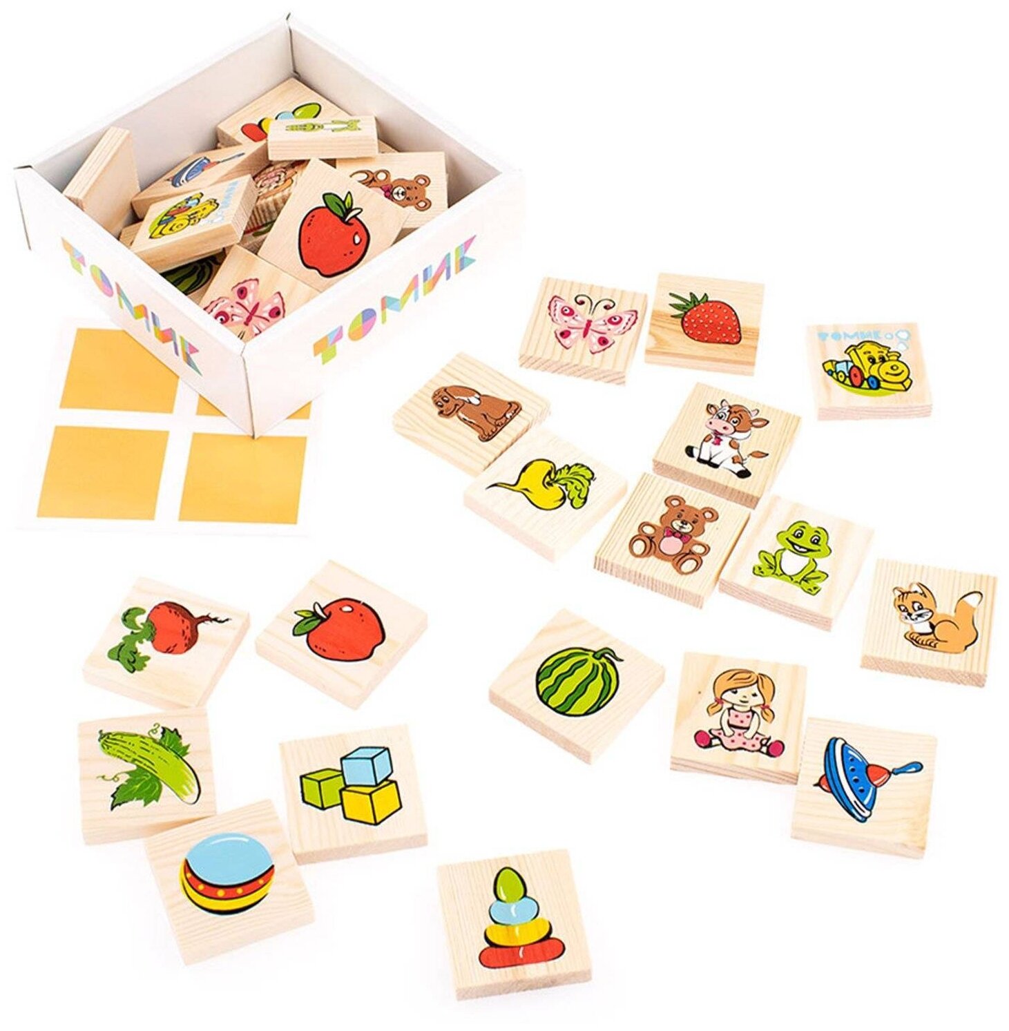 Традиционная мемори игра, которая никогда не потеряет своей привлекательности. Можно дать возможность ребенку самостоятельно потренировать память и внимательность, а можно поиграть вместе, добавив соревновательный элемент и азарт. Фишки изготовлены из натурального дерева с использованием красок на водной основе.