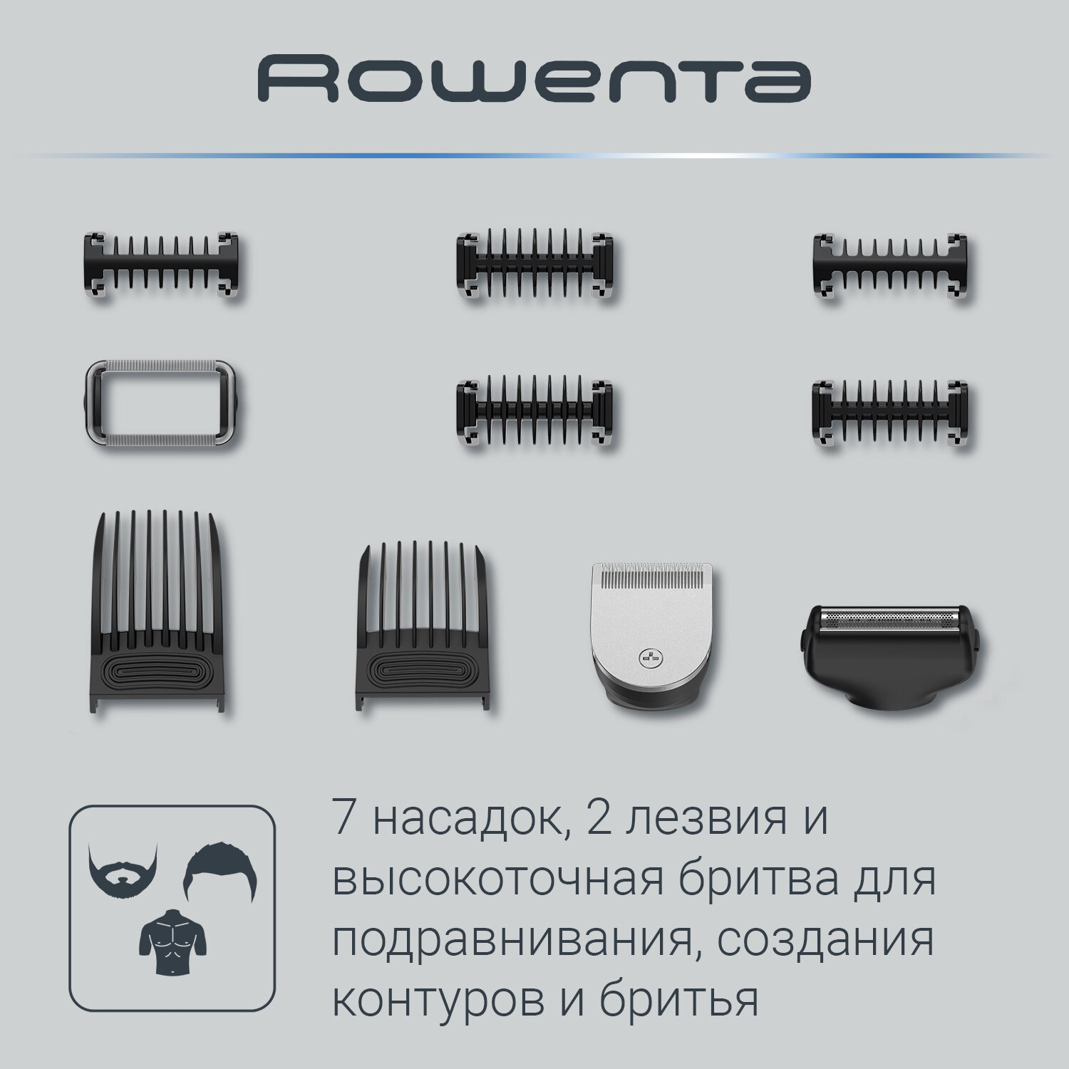 | Насадки | Бритвенная, Гребень 1 мм, Гребень 2 мм, Гребень 3 мм, Гребень 5 мм, Гребень 6 мм, Регулируемый гребень 8-17 мм - 2 шт. |
