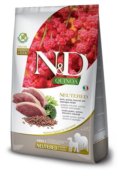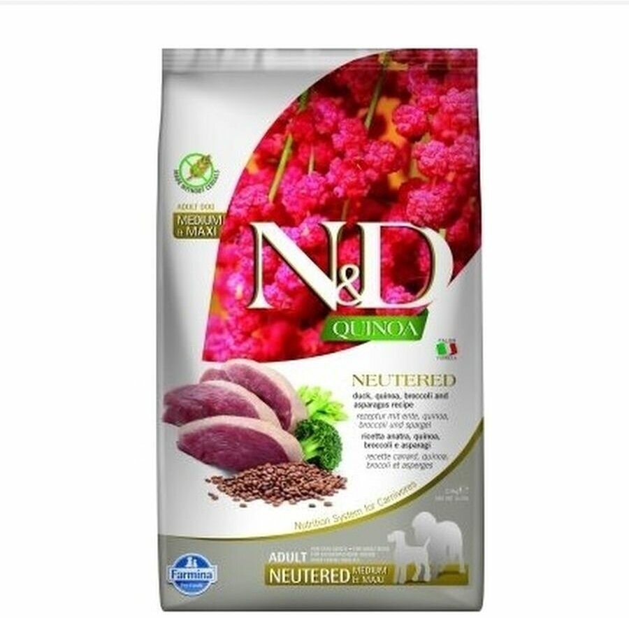 Farmina N&D Quinoa Neuteredt Medium & Max беззерновой с уткой, брокколи и спаржей . Беззерновой сухой корм Фармина с уткой, брокколи и спаржей предназначен для взрослых стерилизованных собак средних и крупных пород. По ингредиентному составу относится к кормам класса холистик. Содержит все витамины и минеральные вещества необходимые для повседневного здорового питания вашего питомца.
