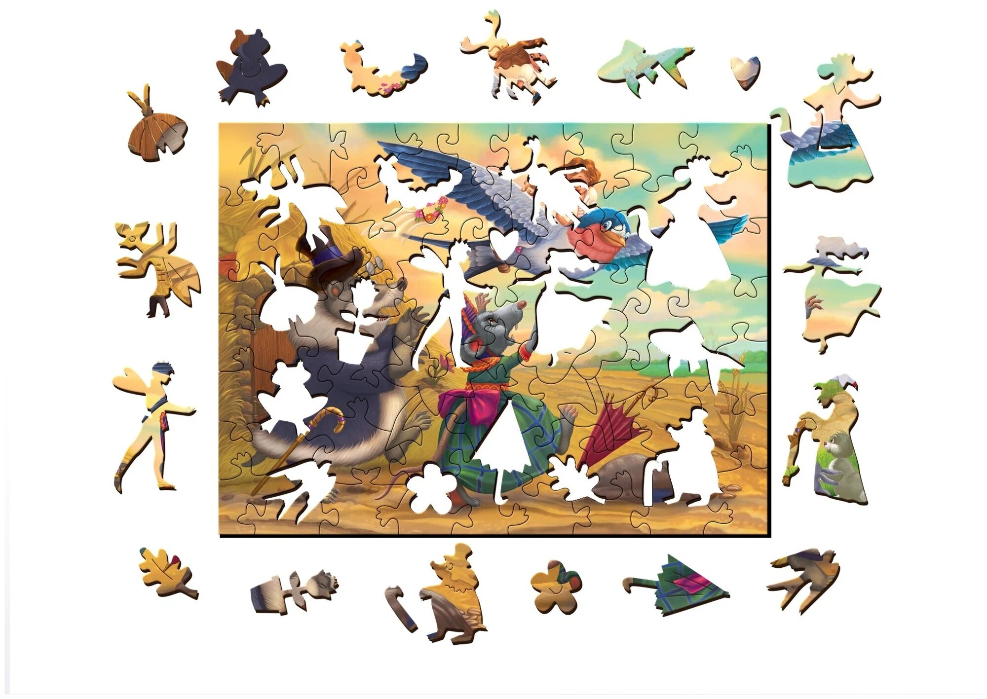 Стараясь передать сказочную атмосферу, мы сделали картинку на пазле интересной и насыщенной. Мы наносим изображение прямо на дерево, чтобы вы смогли прочувствовать его структуру и приятный запах. Мы абсолютно точно вымеряем и вырезаем каждую деталь, поэтому собирать картинку легко, подбирая нужные контуры и изображения.