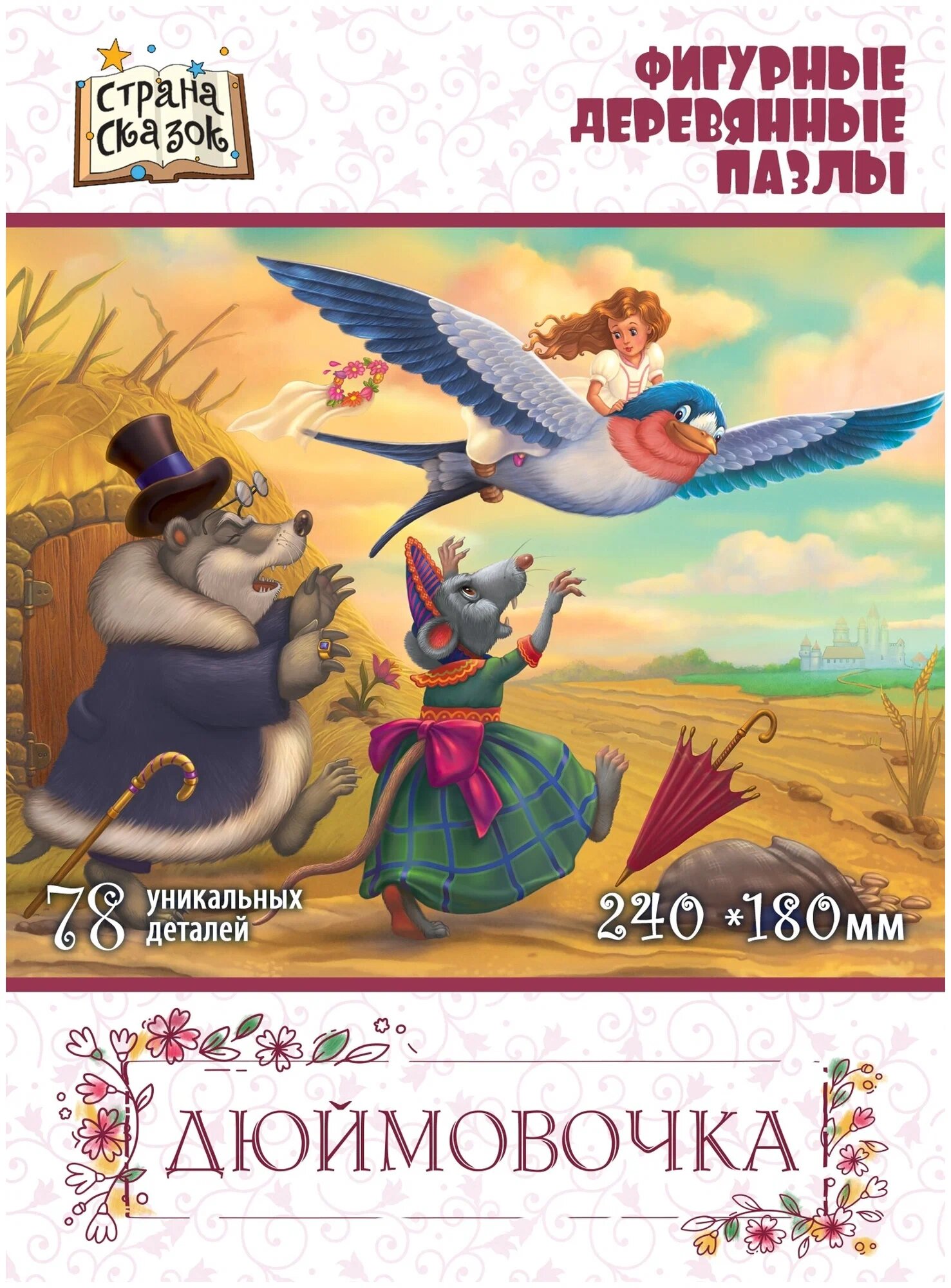 Собирая пазл вместе с ребенком, вы погрузитесь в мир сказки "Дюймовочка" датского писателя Ханса Кристиана Андерсена. С помощью тематических деталей пазла познакомьте его с персонажами сказки, обсудите их роли, придумайте вместе новые истории. Предлагаем вам соединить все детали вместе, собрав таким образом изображение целиком.
