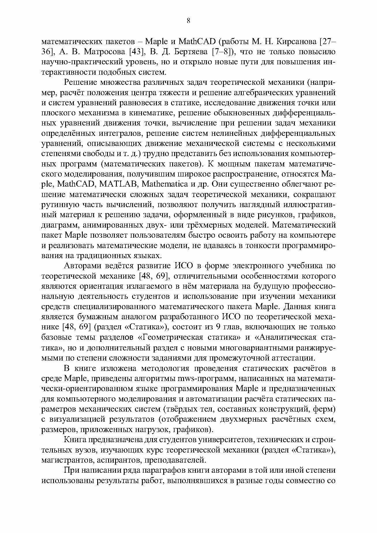 Изложены основы теории по разделу "Статика" в объёме требований программ по курсу "Теоретическая механика" для технических специальностей высшего профессионального образования, приведены задания разного уровня сложности, методические указания с примерами выполнения этих заданий и программы для их решения в среде Maple.