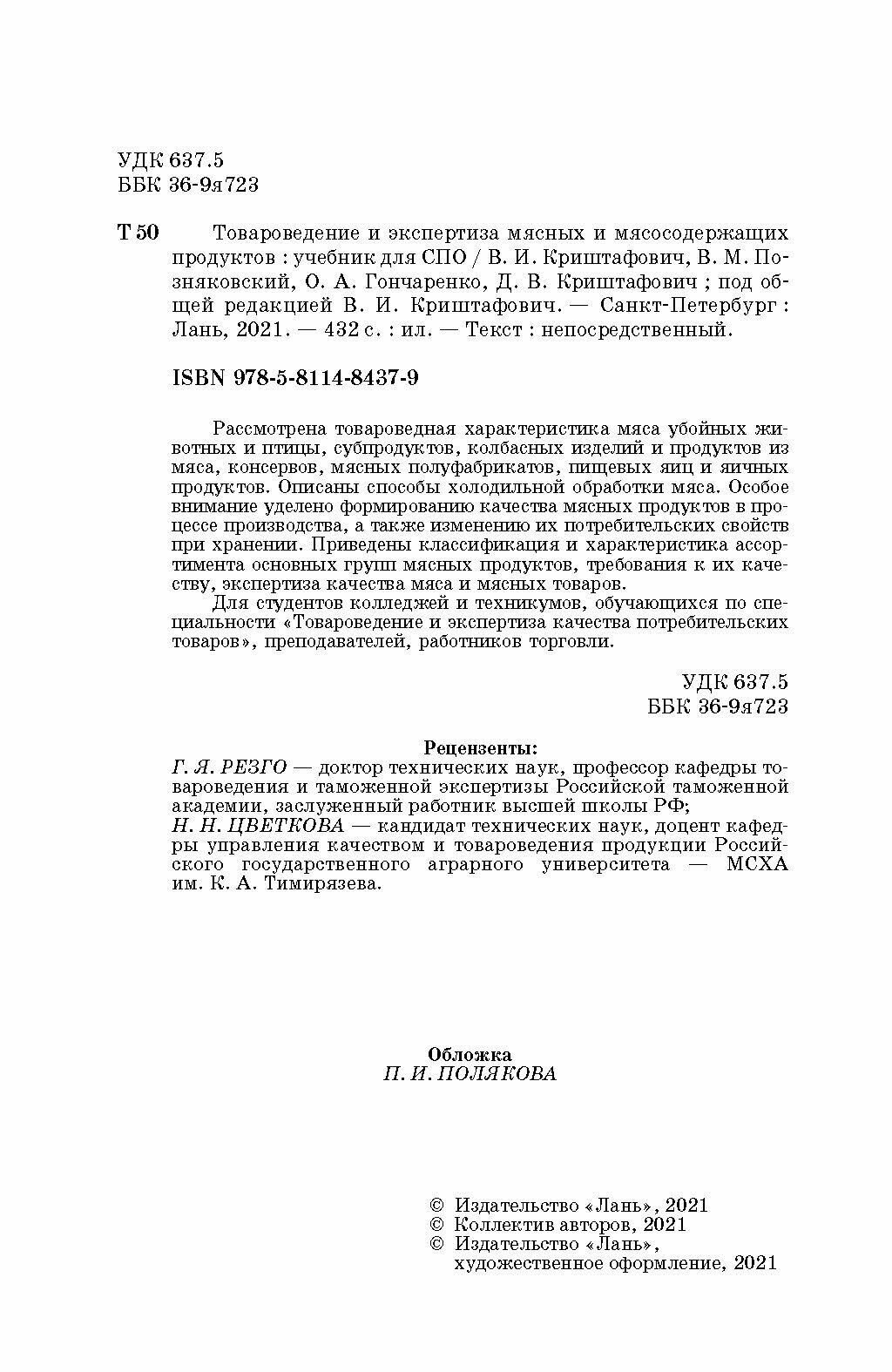 Товароведение и экспертиза мясных и мясосодержащих продуктов. Учебник для СПО (Криштафович Валентина Ивановна, Позняковский Валерий Михайлович, Гончаренко Оксана Анатольевна, Криштафович Дмитрий Валентинович); Лань, 2021