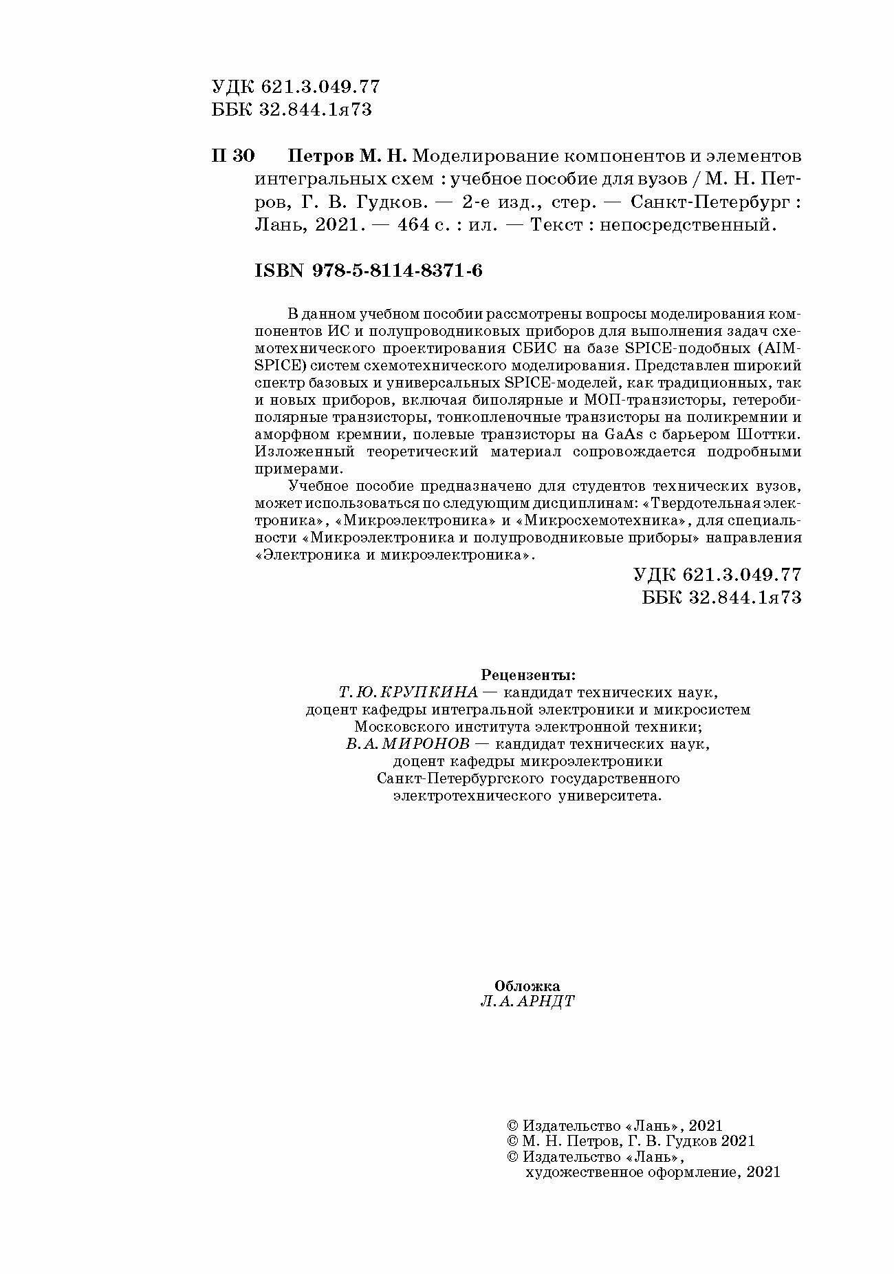 Моделирование компонентов и элементов интегральных схем (Петров Михаил Николаевич, Гудков Геннадий Владимирович); Лань, 2021