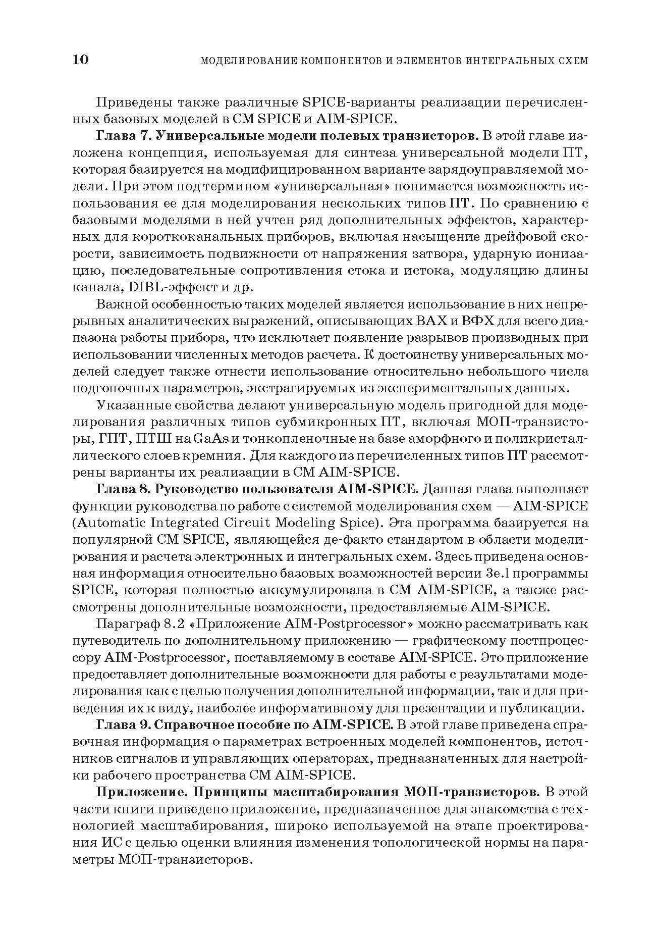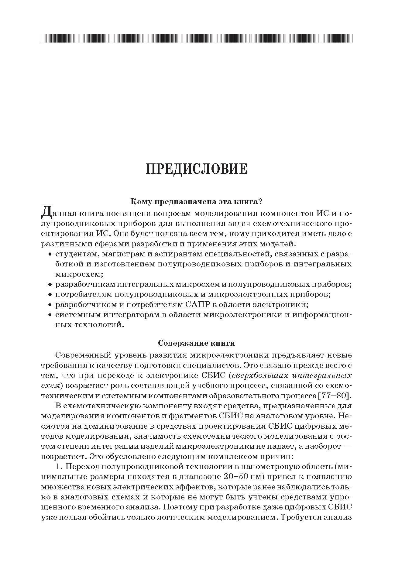В данном учебном пособии рассмотрены вопросы моделирования компонентов ИС и полупроводниковых приборов для выполнения задач схемотехнического проектирования СБИС на базе SPICE-подобных (AIM- SPICE) систем схемотехнического моделирования. Представлен широкий спектр базовых и универсальных SPICE-моделей, как традиционных, так и новых приборов, включая биполярные и МОП-транзисторы, гетеробиполярные транзисторы, тонкопленочные транзисторы на поликремнии и аморфном кремнии, полевые транзисторы на GaAs с барьером Шоттки. Изложенный теоретический материал сопровождается подробными примерами.