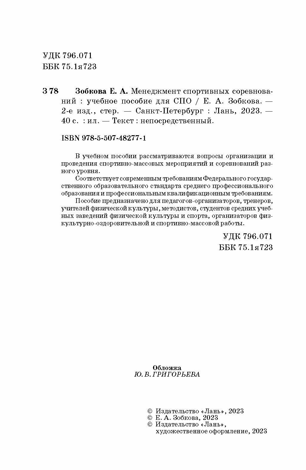 Менеджмент спортивных соревнований. Учебное пособие для СПО (Е. А. Зобкова); Издательство ЛАНЬ, 2021