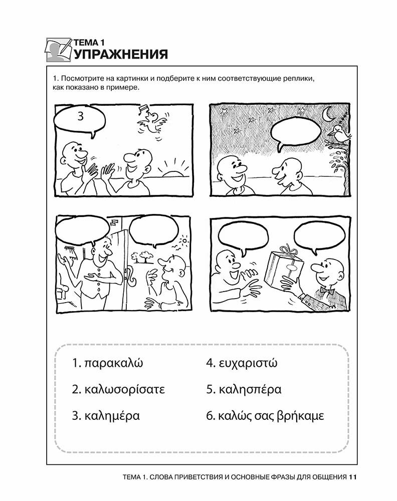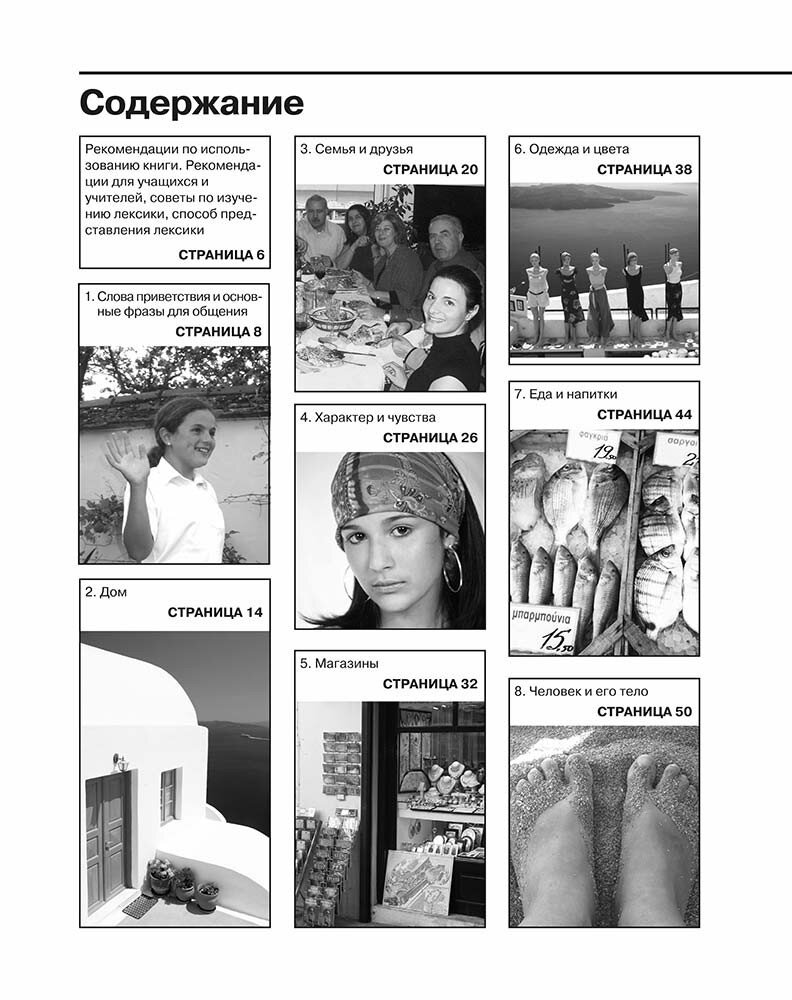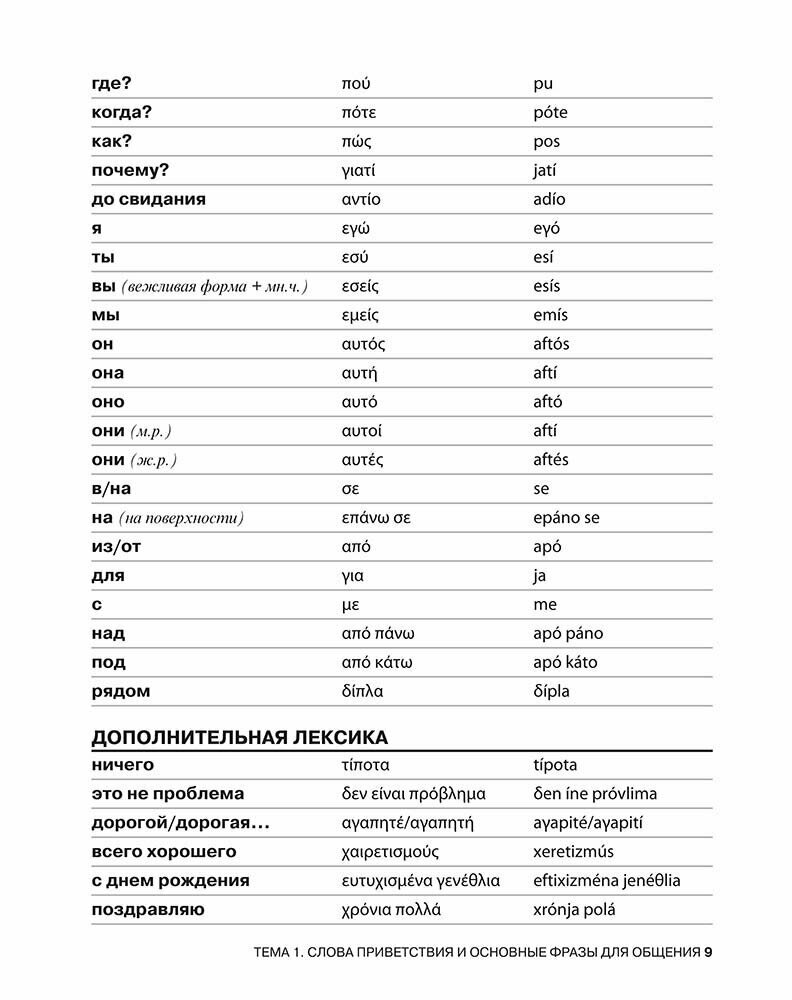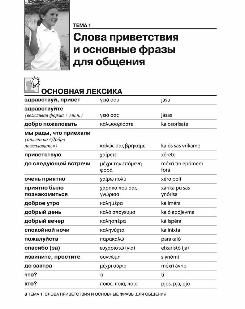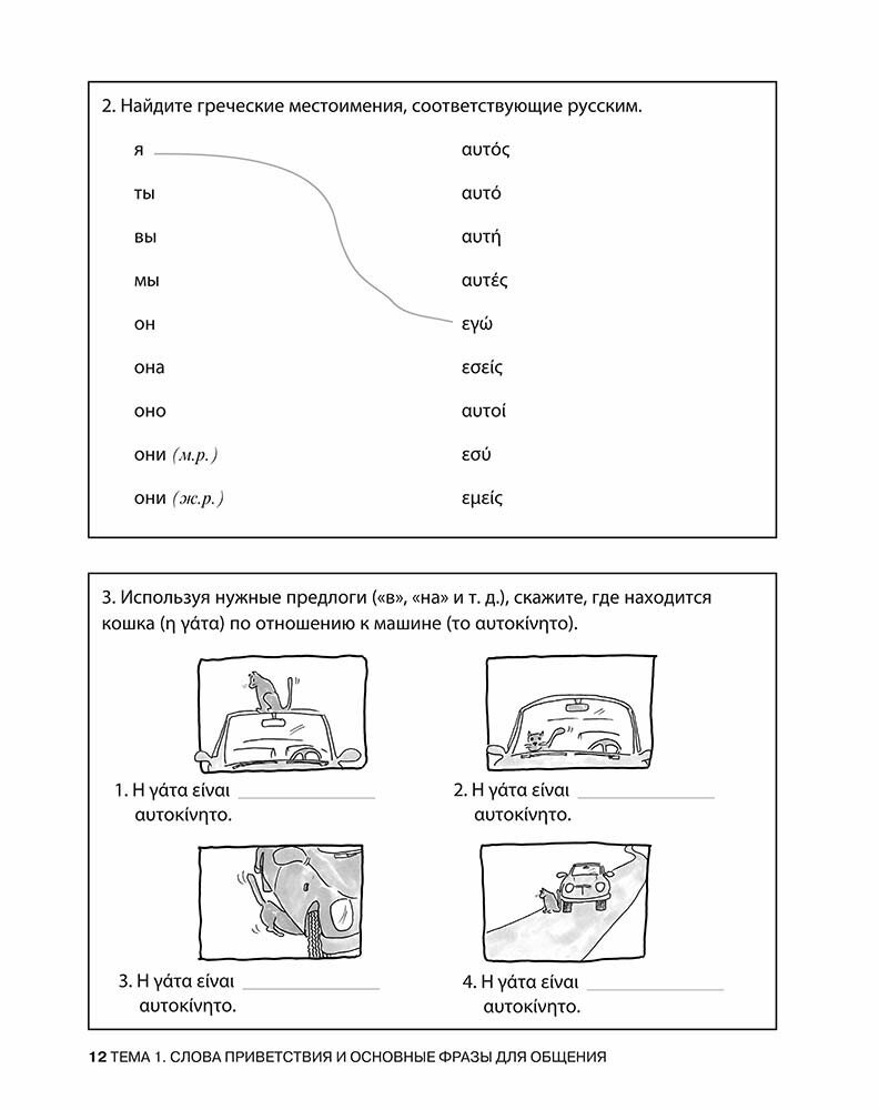 На первый взгляд, полезное пособие. Удобно структурировано для начинающих - много графики для облегчения запоминания, все разделы построены единообразно - лексический блок по теме с основной и дополнительной лексикой, далее полезные фразы, где лексика вписана в синтаксическую конструкцию, потом упражнения на закрепление и в конце раздела теоретическая и грамматическая справка. На мой взгляд, задания небанальные - где надо кроссворд решить, где в таблице из букв найти греческие слова - дан только их перевод по-русски. Есть и привычные упражнения, где в строку надо верно вписать пропущенное слово. Предполагается, что аудио к упражнениям можно как-то отдельно на сайте издательства приобрести. Единственное, что расстроило - мягкий переплет, клееный корешок, боюсь, если как следует с этой книжкой работать, может развалиться. Еще важно, что в книгу добавлено множество мнемонических карточек с лексикой, очень удобно, что не надо их самой делать.