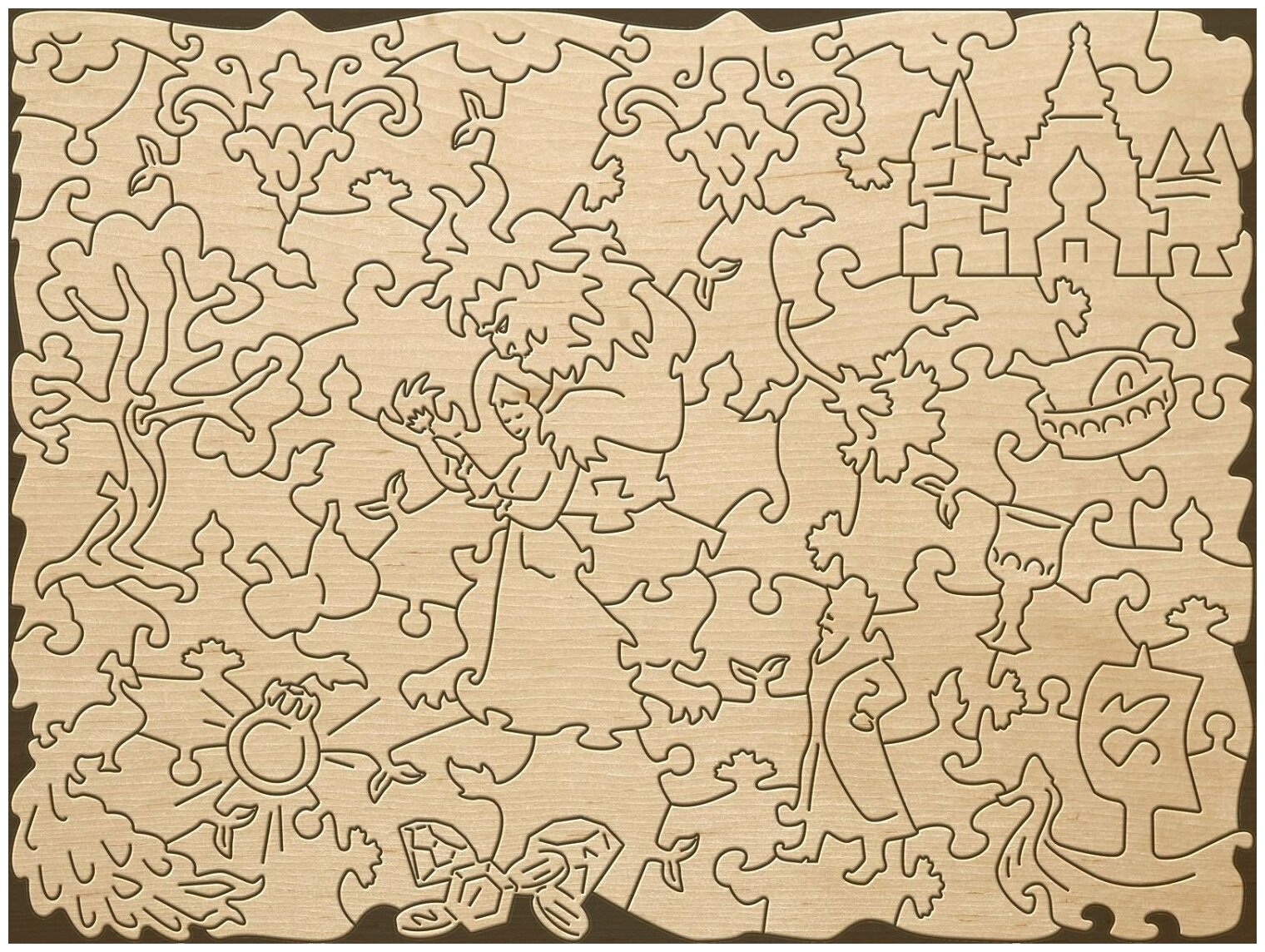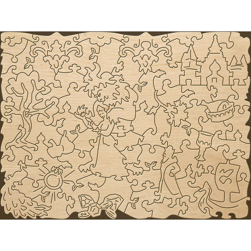 Фигурный пазл отличается от стандартного необычной формой деталей. Кроме того, часть деталей выполнены в форме предметов, связанных с тематикой картинки. В данном случае это, персонажи и предметы связанные со сказкой "Аленький цветочек". Детали пазла выполнены из фанеры. Рисунок нанесен прямо на дерево с помощью специального принтера, он долговечен и не сотрется даже после многократных сборок. Такой пазл понравится и детям и взрослым, ведь сборка доставляет визуальное и тактильное удовольствие.