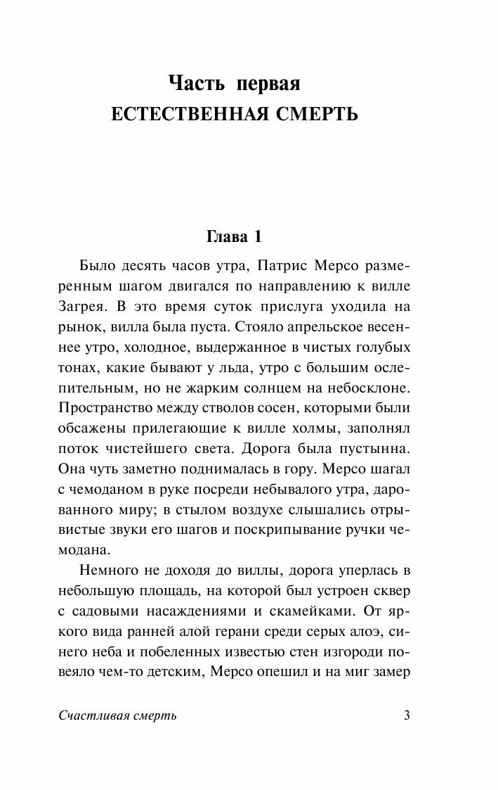 Счастливая смерть – небольшой роман, который можно легко осилить за один вечер в прочтении, и ещё пару дней обдумывать его. Хотя, главная мысль заложена, как в названии книги, так и частях, на которые она поделена.