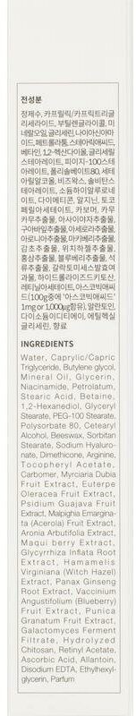 | Состав | water; caprylic/capric triglyceride; butylene glycol; mineral oil; glycerin; niacinamide; petrolatum; stearic acid; betaine; 1,2-hexanediol; glyceryl stearate; peg-100 stearate; polysorbate 80; cetearyl alcohol; glyceryl stearate; beeswax; sorbitan stearate; sodium hyaluronate; dimethicone; arginine; tocopheryl acetate; carbomer; myrciaria dubia fruit extract; euterpe oleracea fruit extract; psidium guajava fruit extract; malpighia emarginata (acerola) fruit extract; aronia arbutifolia extract; maqui berry extract; glycyrrhiza inflata root extract; hamamelis virginiana (witch hazel) extract; panax ginseng root extract; vaccinium angustifolium (blueberry) fruit extract; punica granatum fruit extract; galactomyces ferment filtrate; hydrolyzed chitosan; retinyl acetate; ascorbic acid; allantoin; disodium edta; ethylhexylglycerin; parfum |