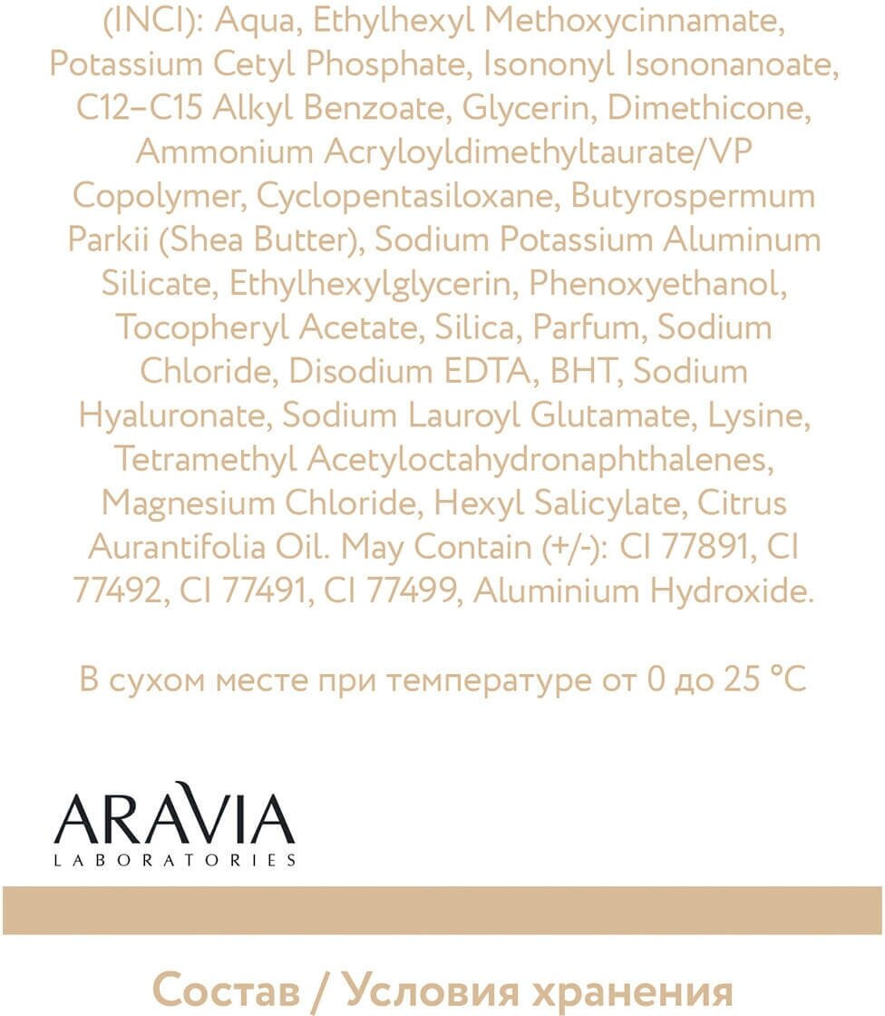 Состав: Aqua, Ethylhexyl Methoxycinnamate, Potassium Cetyl Phosphate, Isononyl Isononanoate, C12c15 Alkyl Benzoate, Glycerin, Dimethicone, Ammonium Acryloyldimethyltaurate/vp Copolymer, Cyclopentasiloxane, Butyrospermum Parkii (shea Butter), Sodium Potassium Aluminum Silicate, Ethylhexylglycerin, Phenoxyethanol, Tocopheryl Acetate, Silica, Parfum, Sodium Chloride, Disodium Edta, Bht, Sodium Hyaluronate, Sodium Lauroyl Glutamate, Lysine, Tetramethyl Acetyloctahydronaphthalenes, Magnesium Chloride, Hexyl Salicylate, Citrus Aurantifolia Oil. May Contain (+/-): Ci 77891, Ci 77492, Ci 77491, Ci 77499, Aluminium Hydroxide.