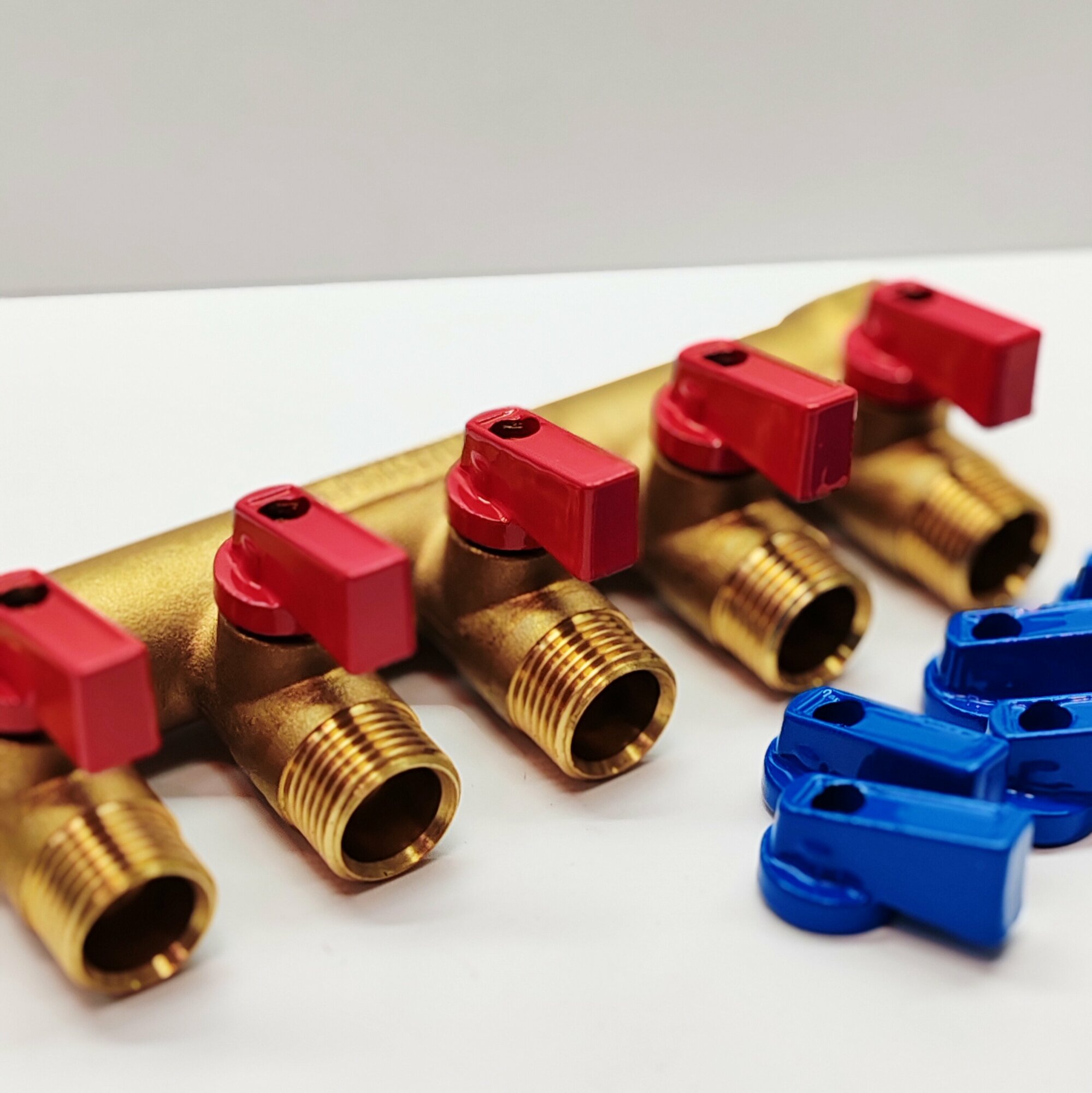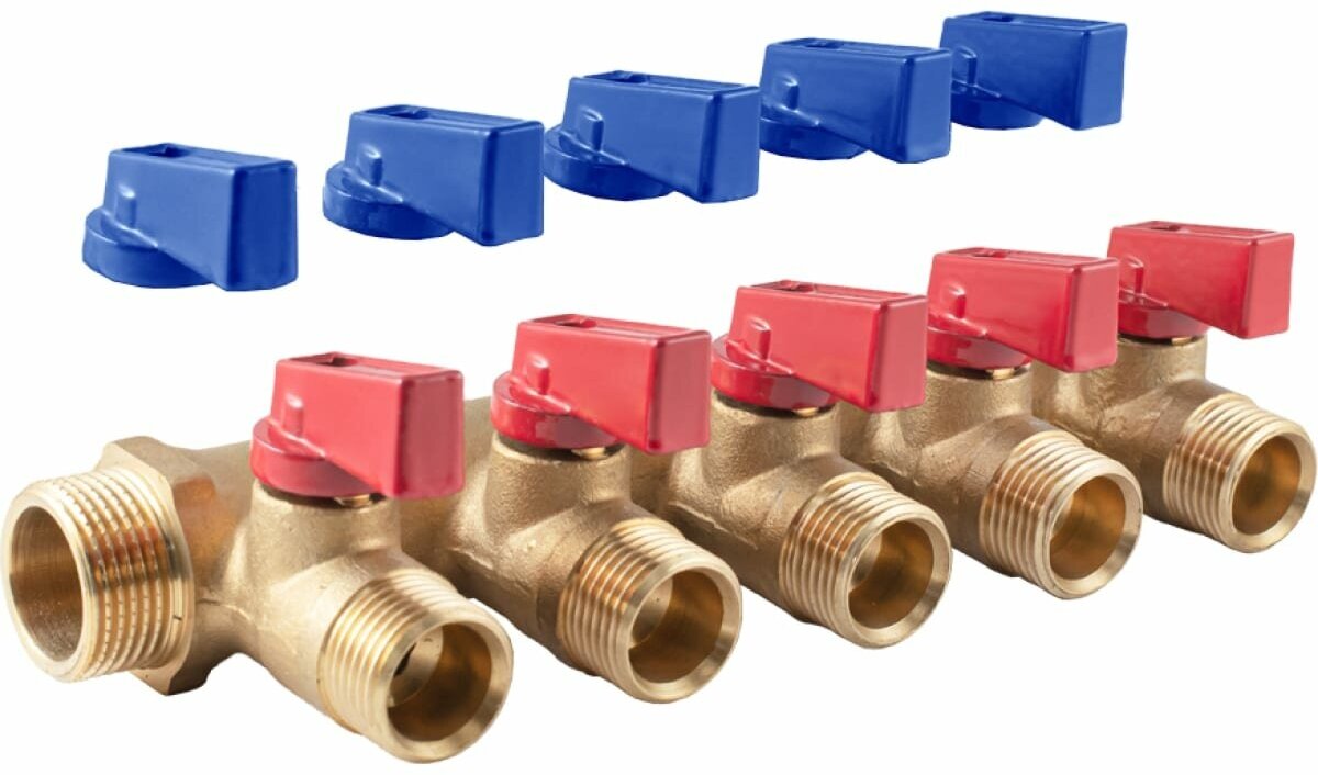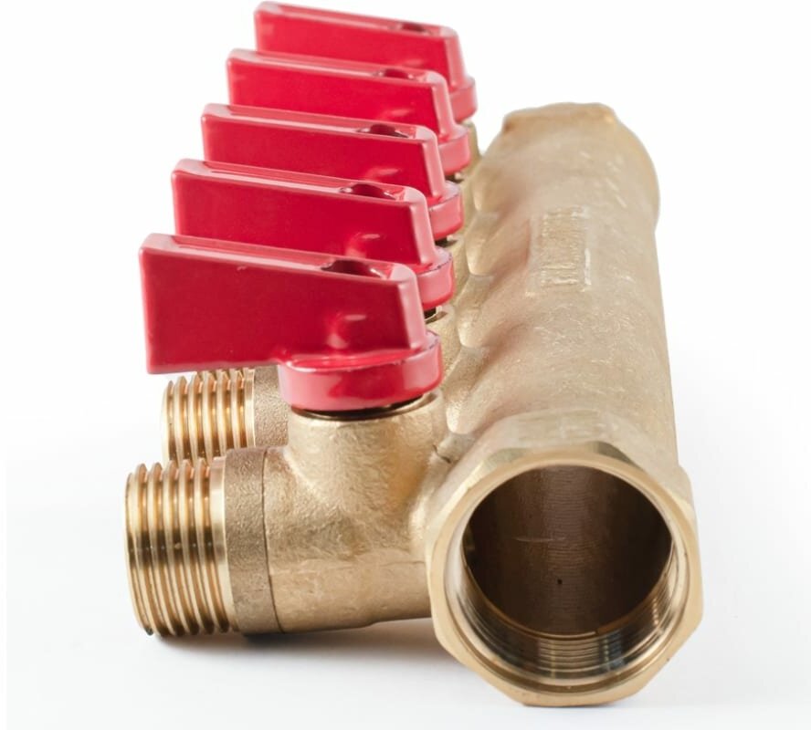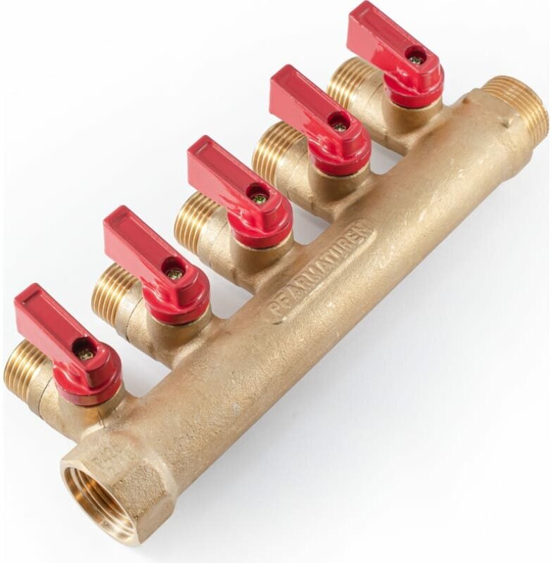 Распределительный коллектор отопления латунный кованый ГxШ 3/4" х 1/2"М (5) с шаровыми кранами.