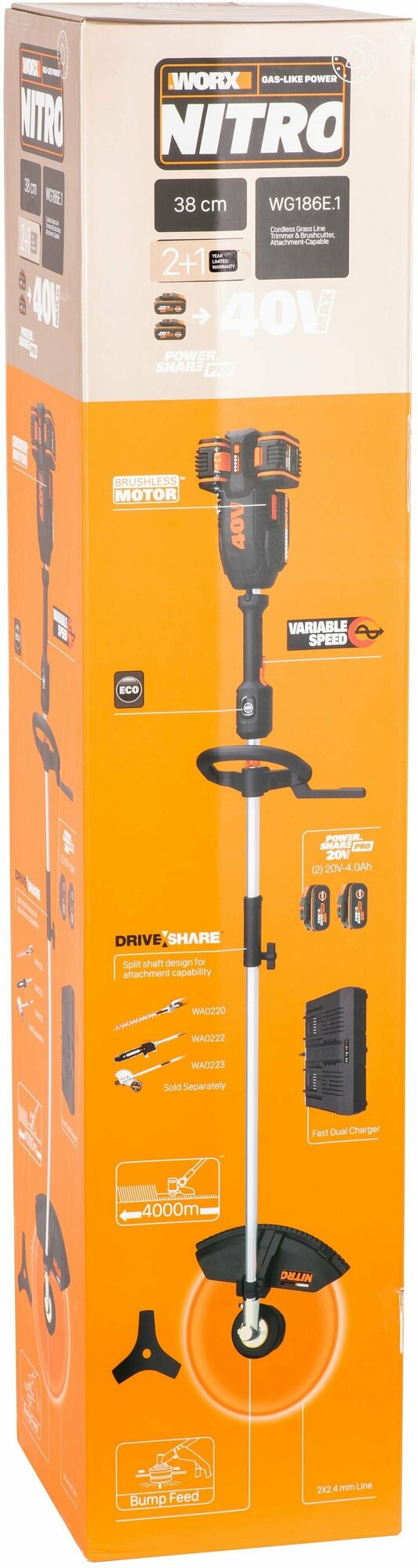 WORX – это легкий и многофункциональный аккумуляторный триммер семейства садовой техники WORX NITRO, который позволит быстро избавить большие территории от зарослей. Садовая техника WORX NITRO по своей мощности и производительности сравнима с бензиновой техникой. Работая сразу от двух новейших аккумуляторов WORX Poweshare PRO 20В, триммер обеспечивает большую длительность автономной работы и оптимально подойдет для обработки участков вдали от электросети.
