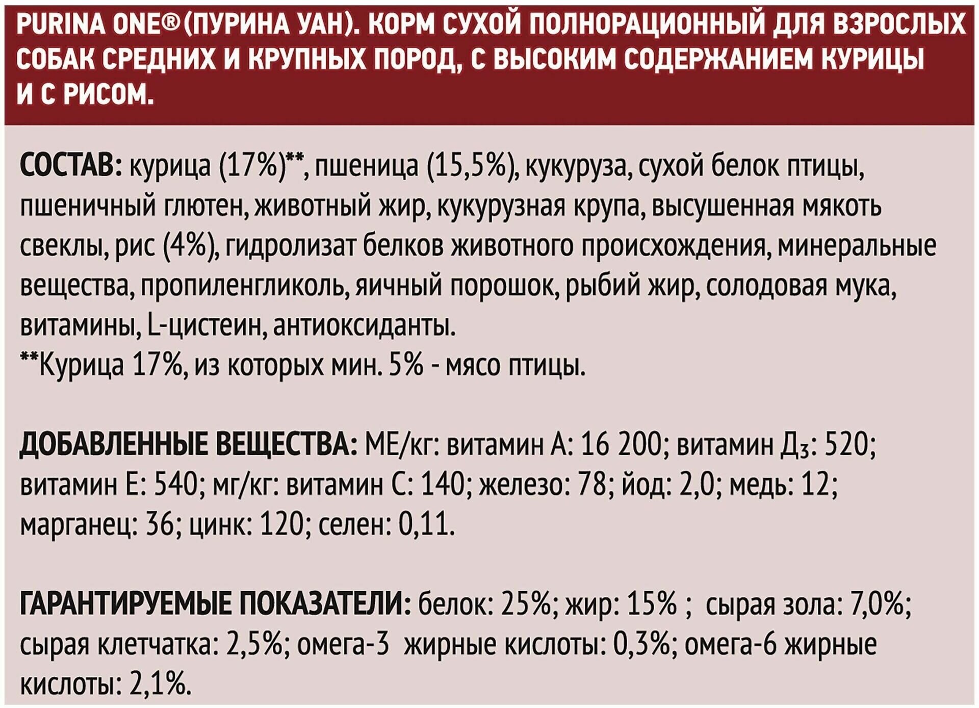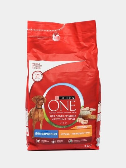 СУХОЙ КОРМ PURINA ONE ADULT ДЛЯ ВЗРОСЛЫХ СОБАК СРЕДНИХ И КРУПНЫХ ПОРОД - АДАПТИРОВАННОЕ ПОЛНОРАЦИОННОЕ ПИТАНИЕ. КОРМ ПРЕКРАСНО СОХРАНЯЕТ СВОИ СВОЙСТВА НА ПРОТЯЖЕНИИ ВСЕГО ПЕРИОДА ИСПОЛЬЗОВАНИЯ, НЕ ВЫВЕТРИВАЕТСЯ И НЕ НАМОКАЕТ. ПОДУШЕЧКИ НЕБОЛЬШИЕ И ХРУСТЯЩИЕ, СОБАКЕ НРАВЯТСЯ ОНИ. КУШАЕТ БЕЗ НАРЕКАНИЙ. АКТИВНАЯ И БОДРАЯ.