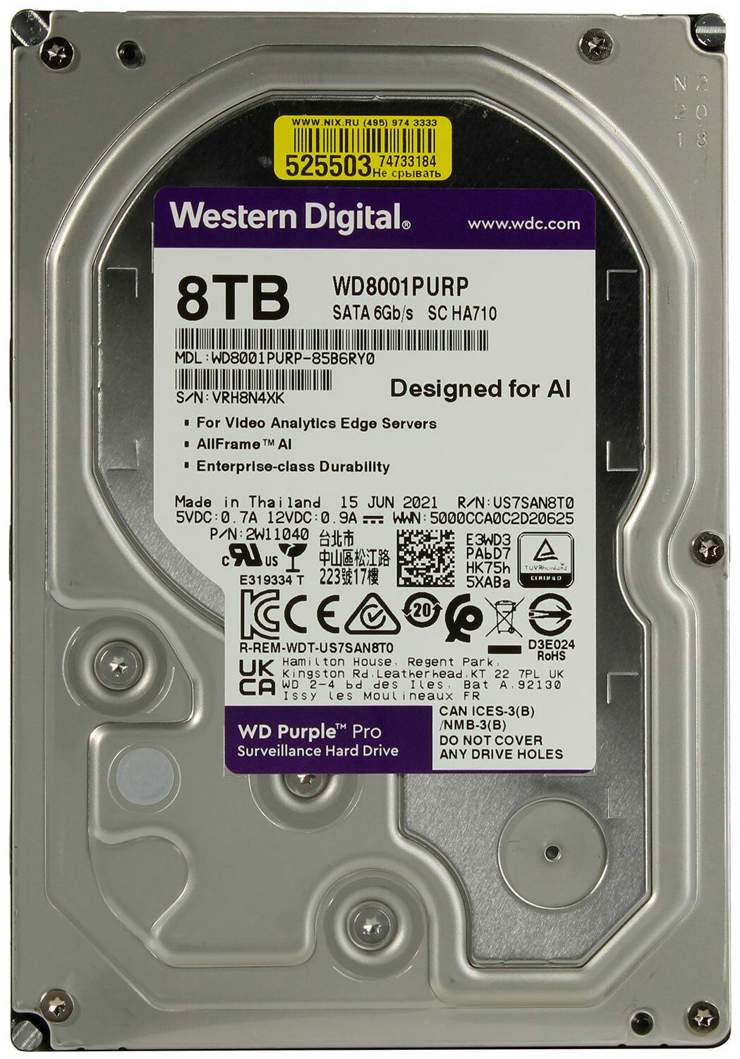 Жесткий диск WD Purple Pro , объем 8 Тб, форм-фактор 3.5", буферная память 256МБ, скорость вращения шпинделя 7200 об/мин, интерфейс SATA-III