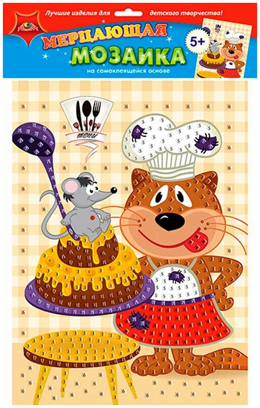 Набор для детского творчества "Мерцающая мозаика" понравится детям от 5-ти лет. На цветной картонной основе числами и цветом показаны места куда необходимо приклеить элементы мозаики. Элементы имеют клеевой слой, поэтому вы обойдетесь без клея и ножниц. В результате получится яркая картинка, которую отлично дополнят глазки и стразы. Набор включает цветную картонную основу размером 25,5 х 35 см, самоклеящиеся цветные элементы мозаики, глазки и стразы. Занятия с помощью этого набора развивают мелкую моторику, внимание, аккуратность. Все необходимые детали для поделки входят в состав набора.