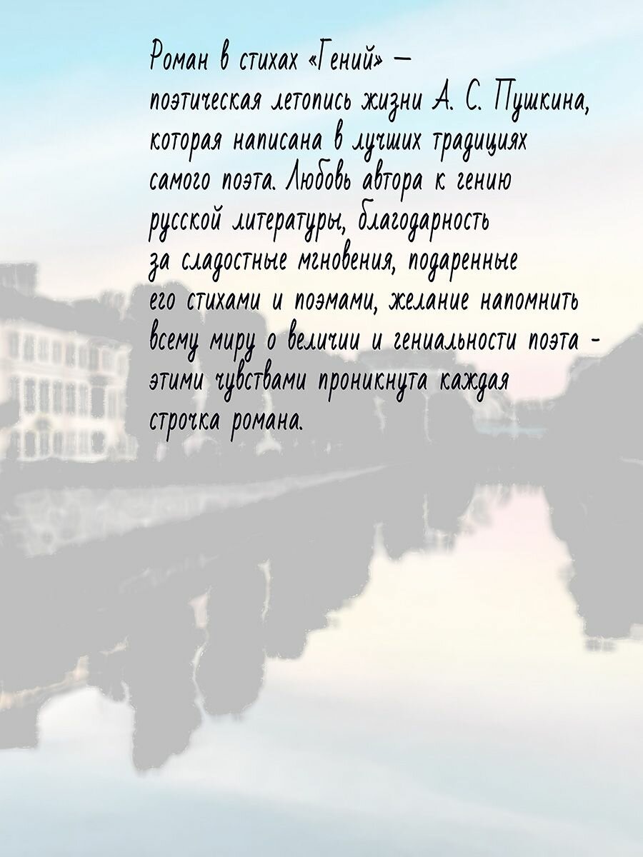 Роман в стихах "Гений" - поэтическая летопись жизни А. С. Пушкина, которая написана в лучших традициях самого поэта. Любовь автора к гению русской литературы, благодарность за сладостные мгновения, подаренные его стихами и поэмами, желание напомнить всему миру о величии и гениальности поэта - этими чувствами проникнута каждая строчка романа. Страница за страницей открываются пред нами счастливые и трагические моменты его жизни. Это поистине шедевр, наполняющий читателя гордостью за причастность к творчеству великого гения, открывающий завесы его души, а иногда и щемящий сердце из-за осознания быстротечности времени и бессилия повернуть его вспять, чтобы предотвратить трагедию…