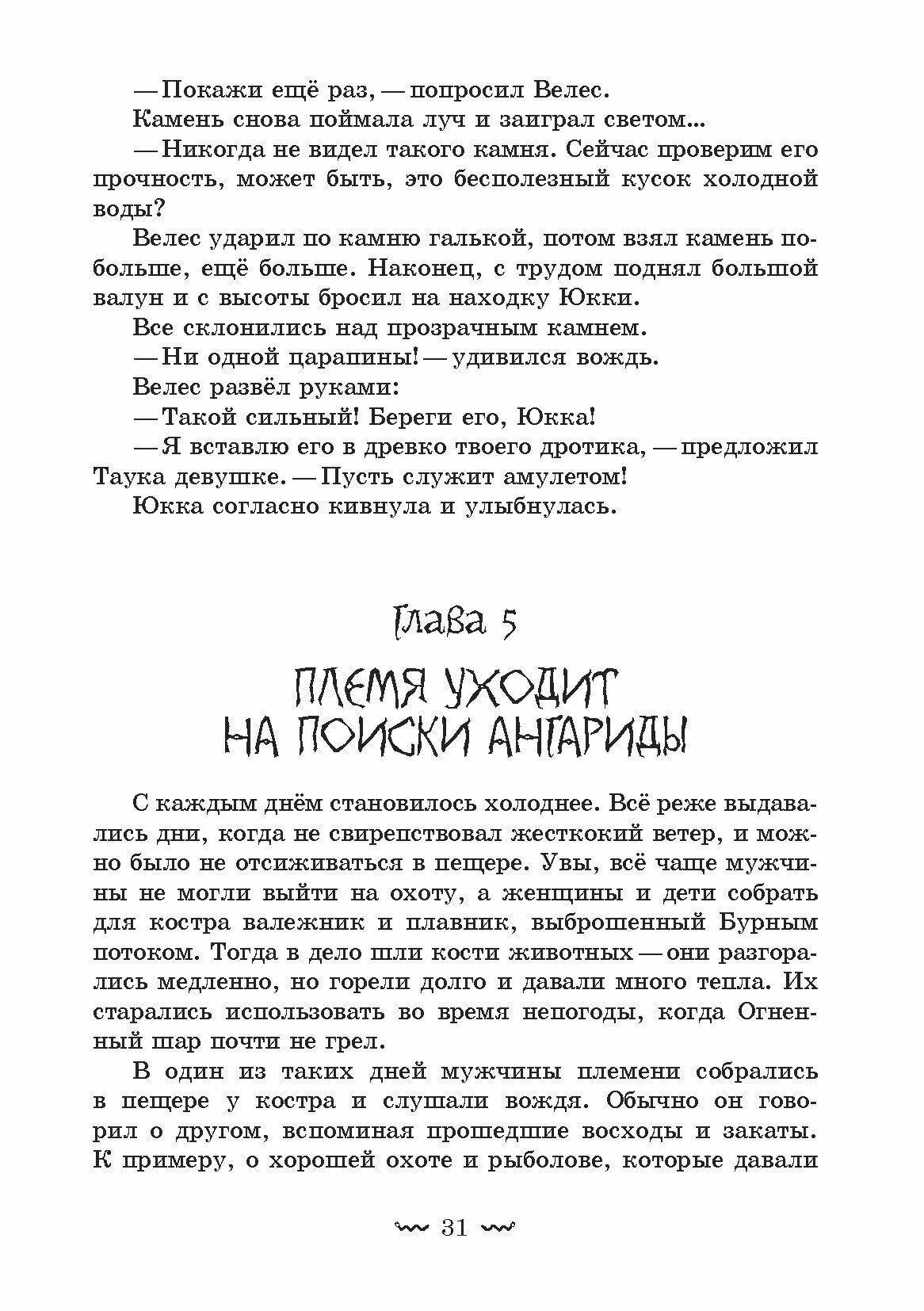Долгие годы жизнь на берегу Бурного потока шла своим чередом: люди жили в удобной пещере, охотились, собирали коренья и ловили рыбу. Но пришли холода. Год от года пустела земля, уходили животные. Пришло время и людскому племени покинуть родные места в поисках новых берегов.
