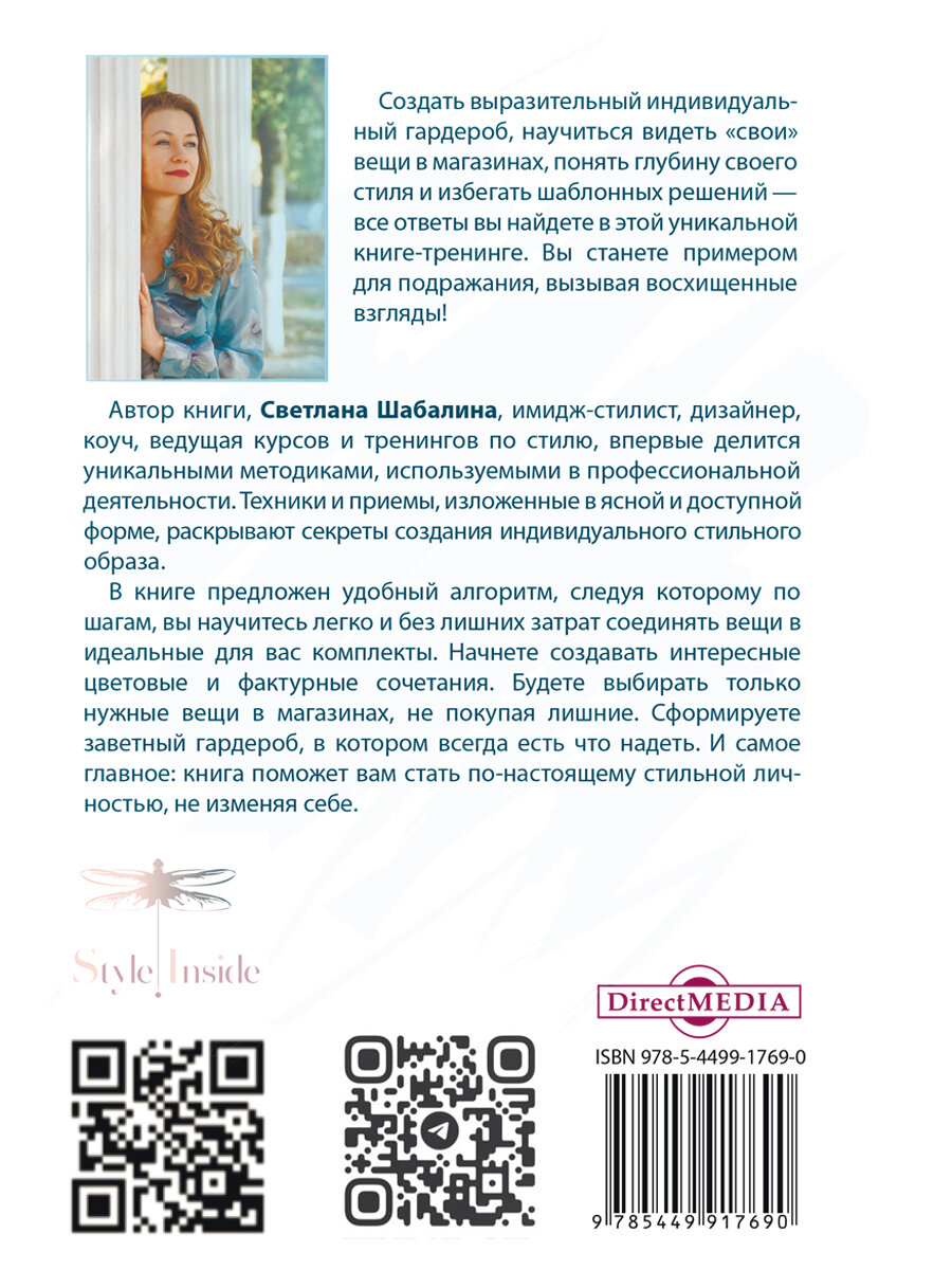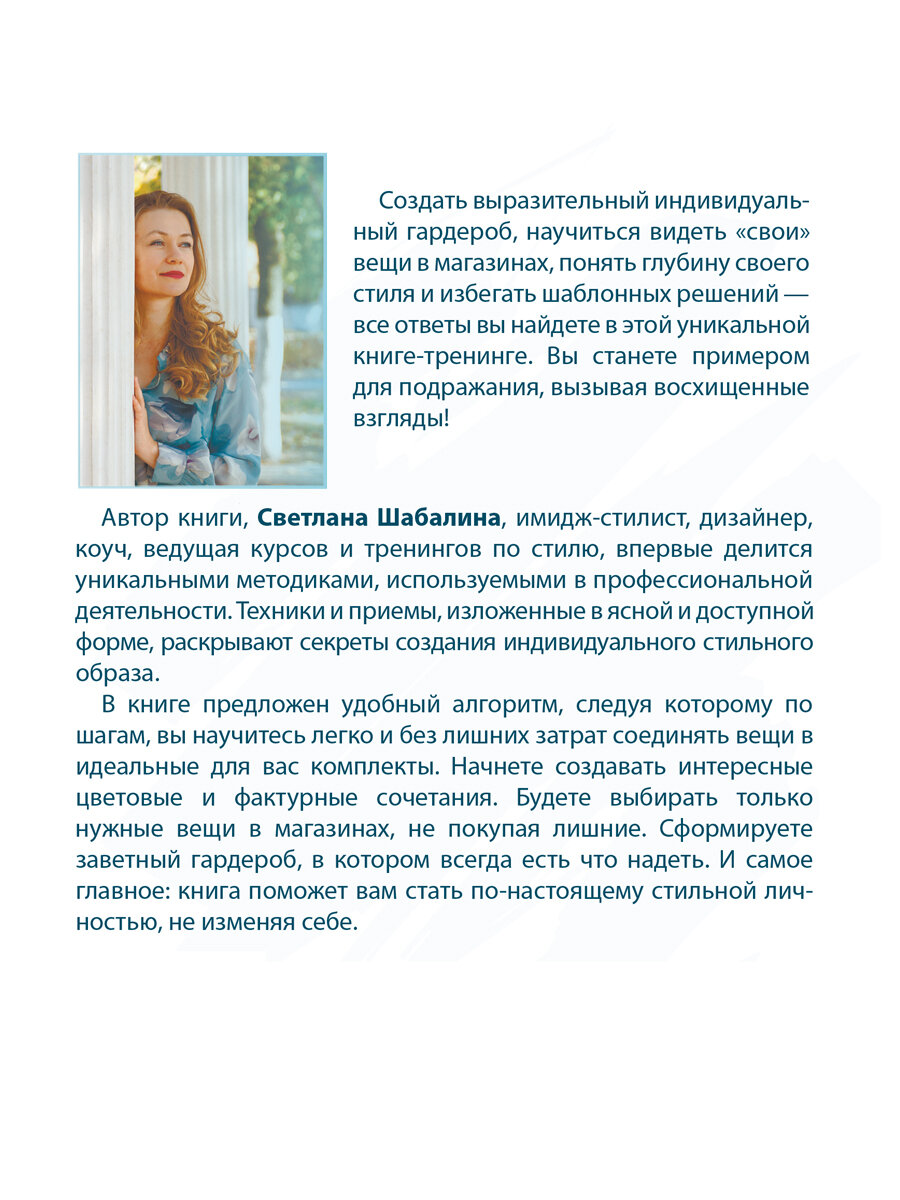 Автор книги, Светлана Шабалина, имидж-стилист, дизайнер, коуч, ведущая курсов и тренингов по стилю, впервые делится уникальными методиками, используемыми в профессиональной деятельности. Техники и приемы, изложенные в ясной и доступной форме, раскрывают секреты создания индивидуального стильного образа.